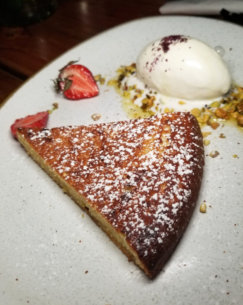 For example, check out this homemade “cheese cake,” which is actually baked, semi-melty and semi-firm goat cheese with a bread crumb and ground pistachio crusted topping. The cheese had a similar texture and flavor to firm mozzarella, and the crust was reminiscent of the coating on a fried mozzarella stick, but sweeter due to the drizzled honey and rosewater that garnished the dish.
