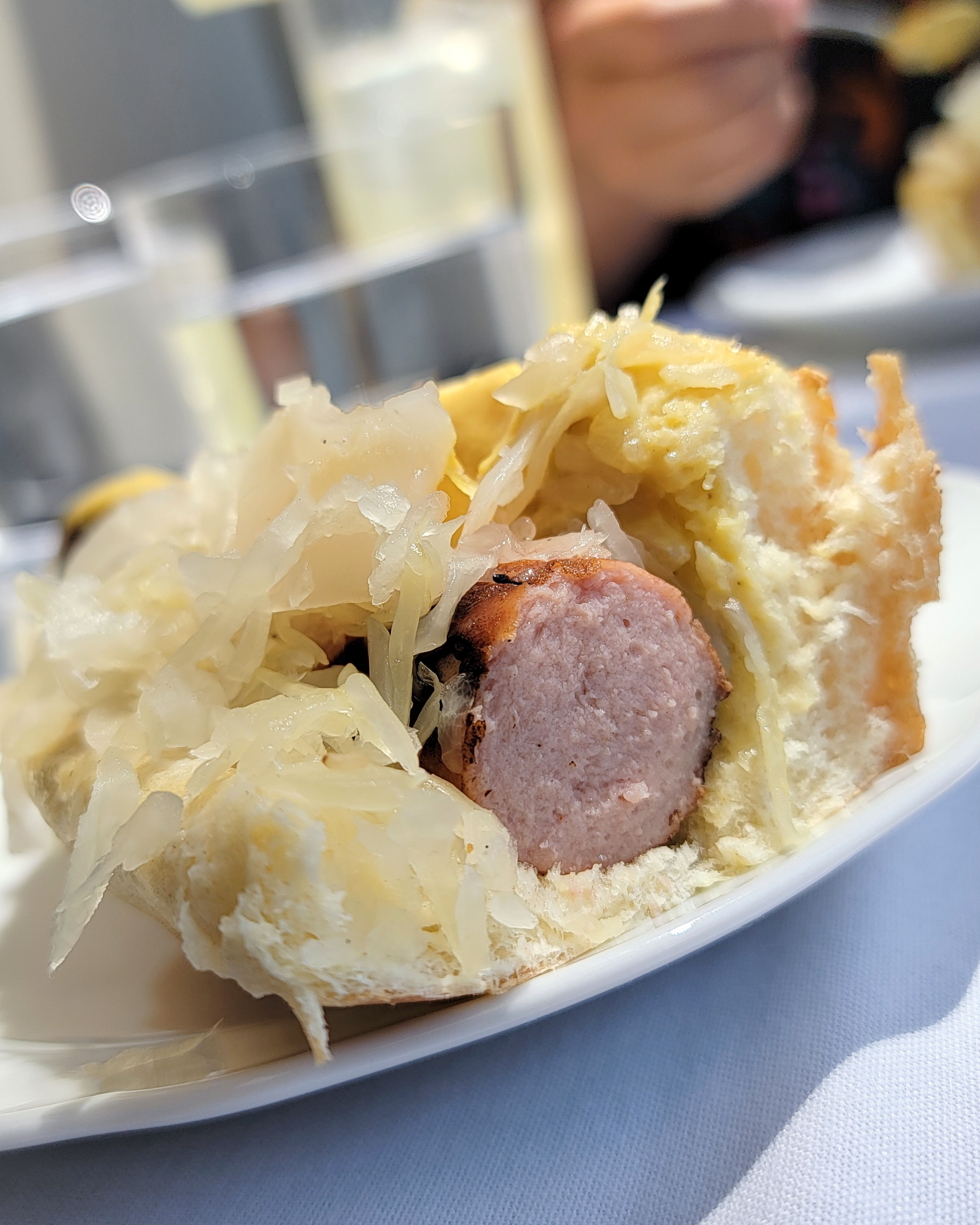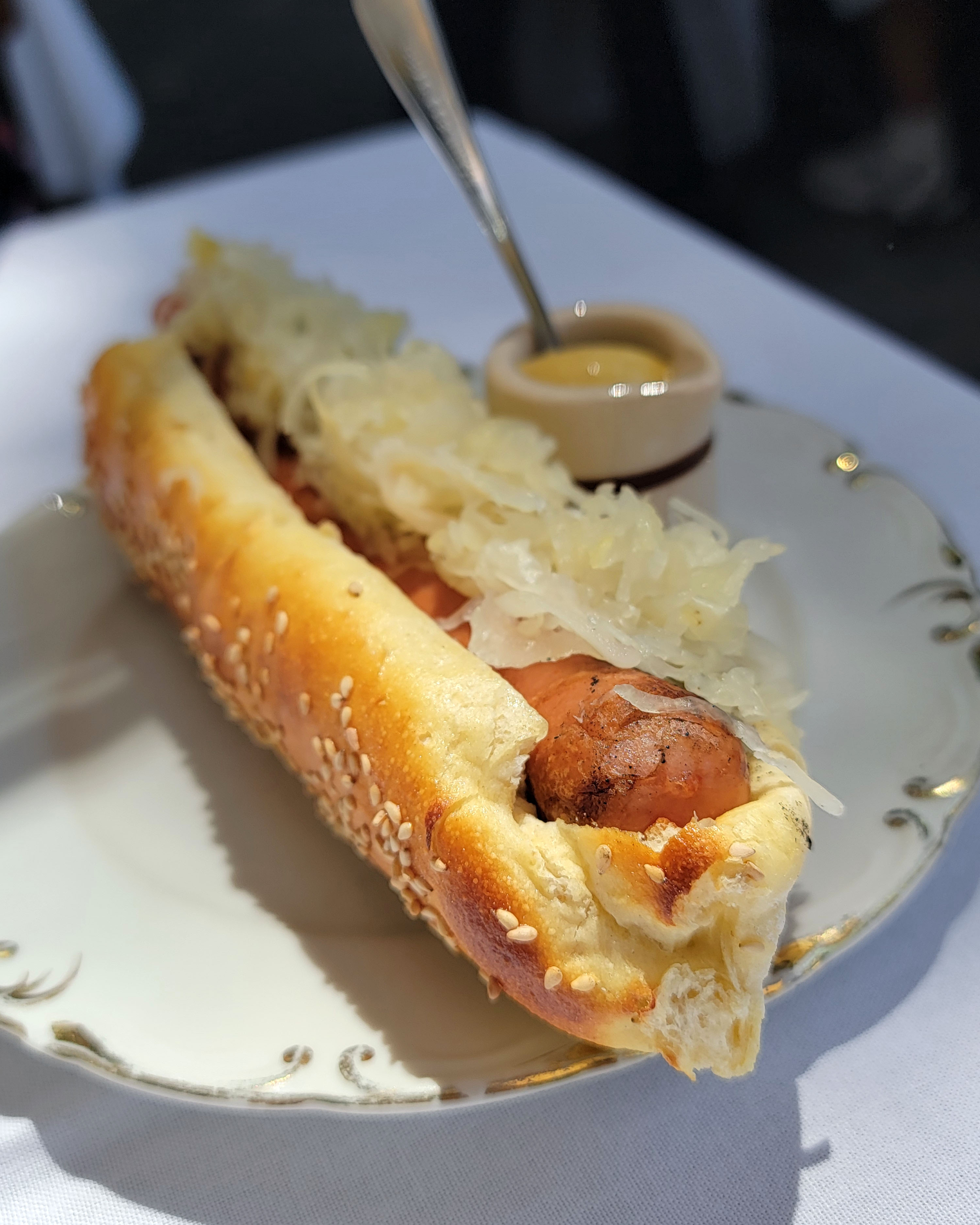 This was a really tasty veal dog with dijon and kraut on a sesame seed bun.