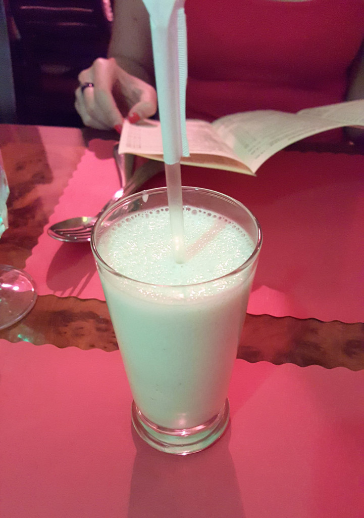 I had a banana lassi. It was good, but I wish it was colder. Drinking room temperature banana yogurt isn’t that appealing. My wife had a pistachio shake, but it was more like a lassi than what we expected a shake to be (cold, creamy, ice cream-ish). They both looked exactly the same, so here is a generic shot. Can you guess which this is?