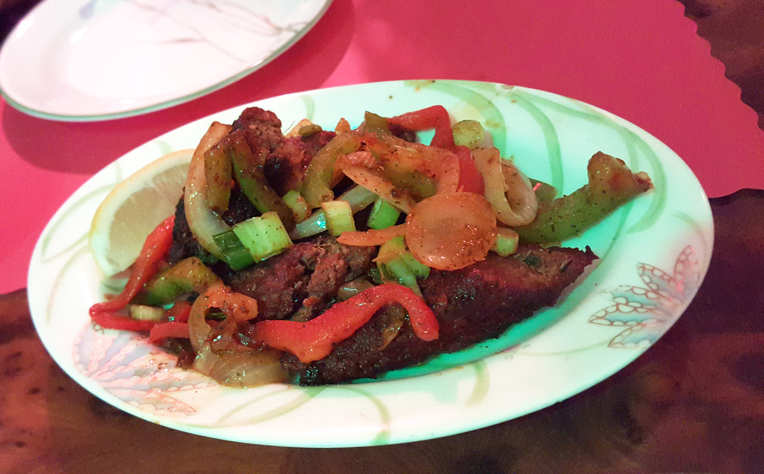 My wife ordered a boneless lamb dish but got semi-bone-in goat instead. No matter – it was really tasty, and the meat was tender.