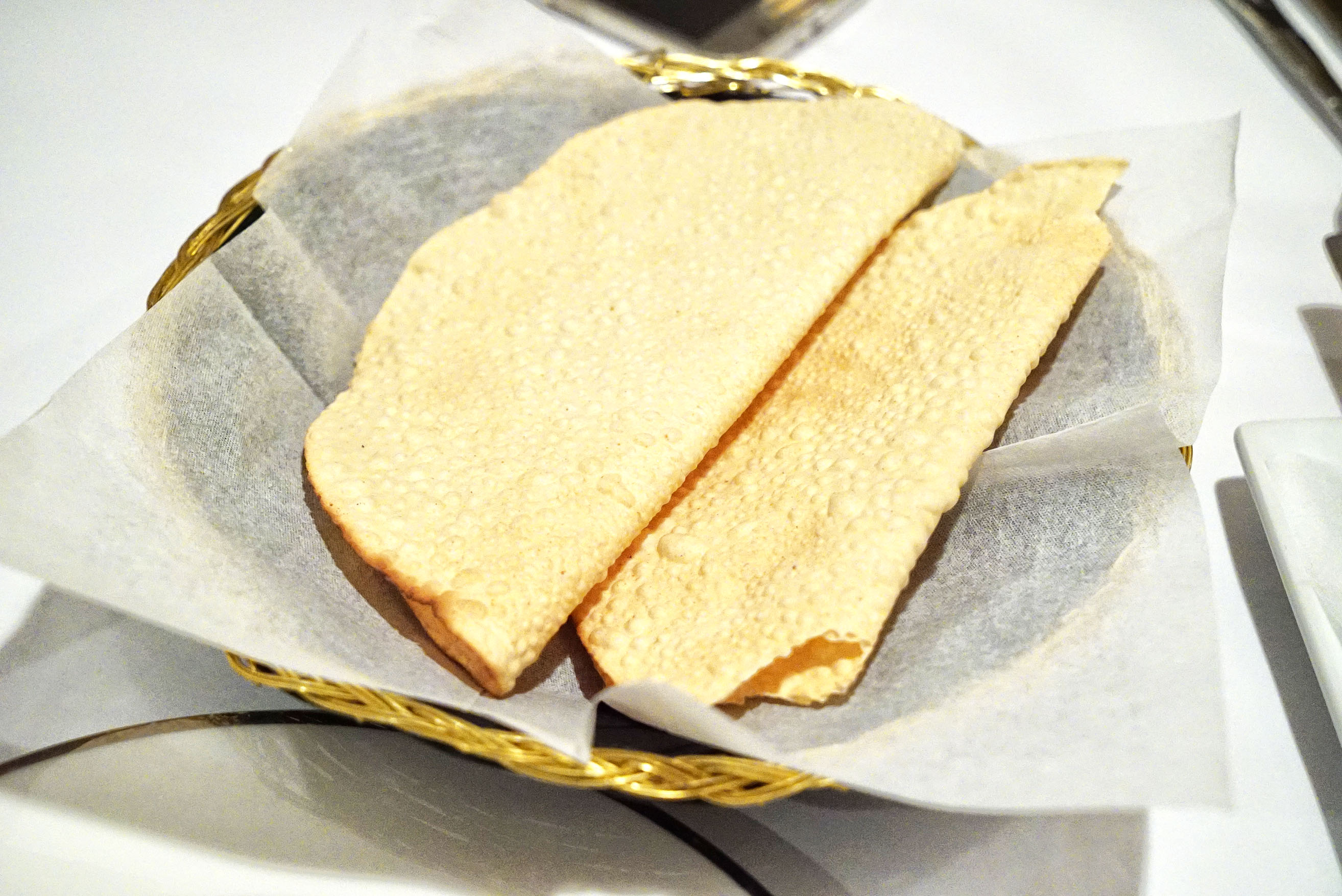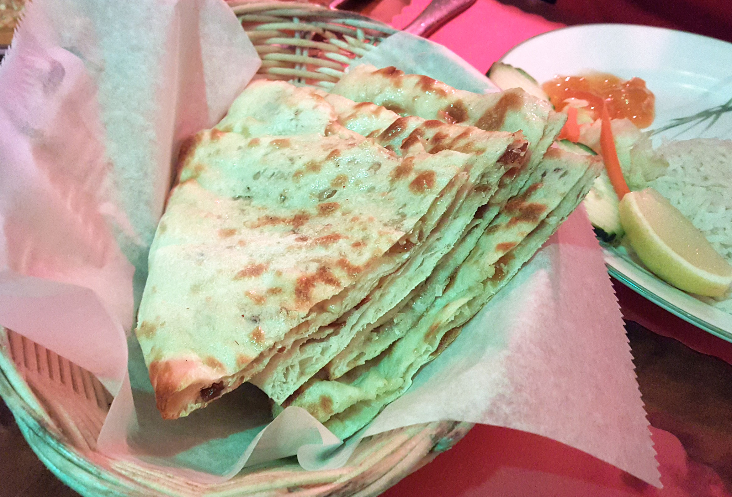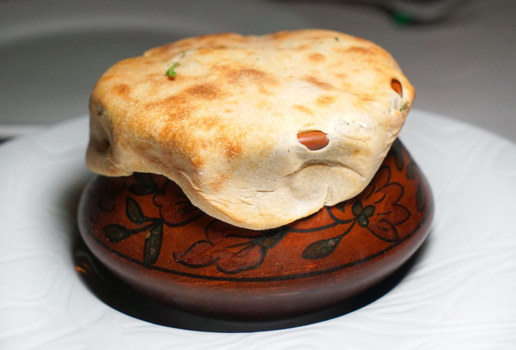 That’s the roasted lamb meat on the left, cucumbers and sauces in the center, and pancakes on the right. In the upper center is an accompaniment that I chose for this course, which was essentially a stuffed naan type bread called kulcha. Mine was stuffed with pastrami and mustard grain (there were many other choices).