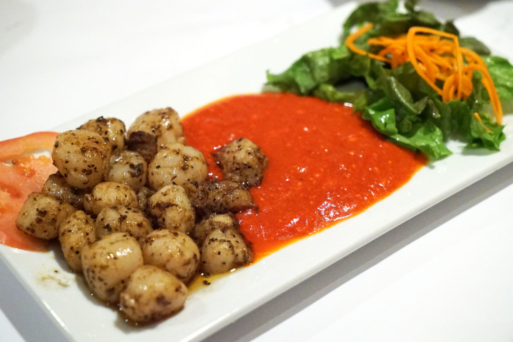 We started with a pair of apps that sounded delicious but ended up being a bit flat from our expectations. First was the pepper crusted scallops. I liked that they had a good grilled-on-the-flattop flavor, but the portion size was a bit small.