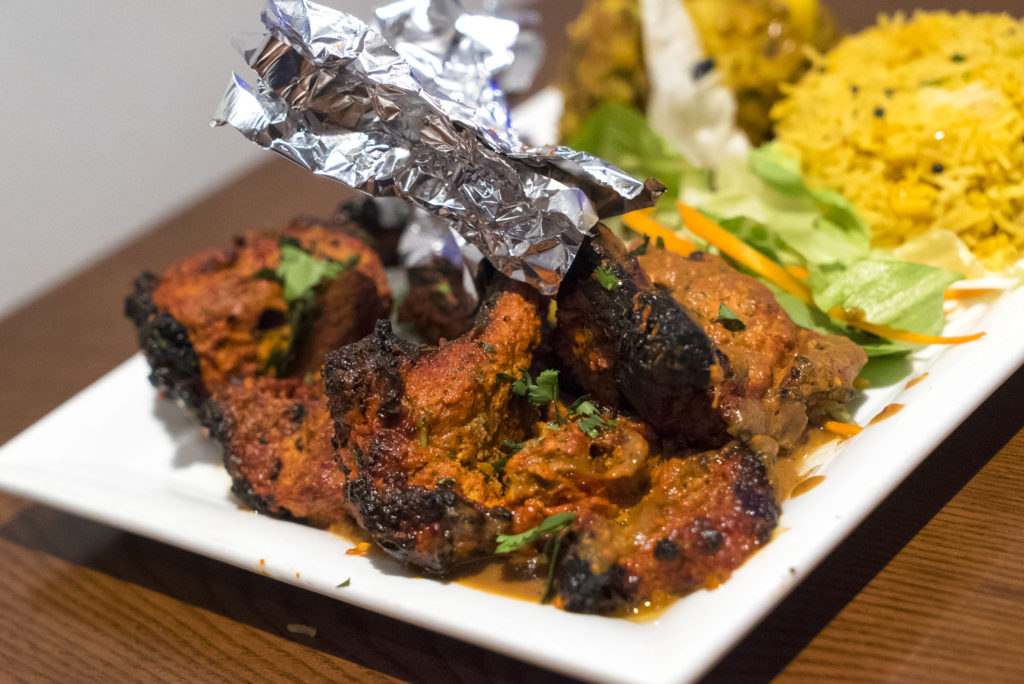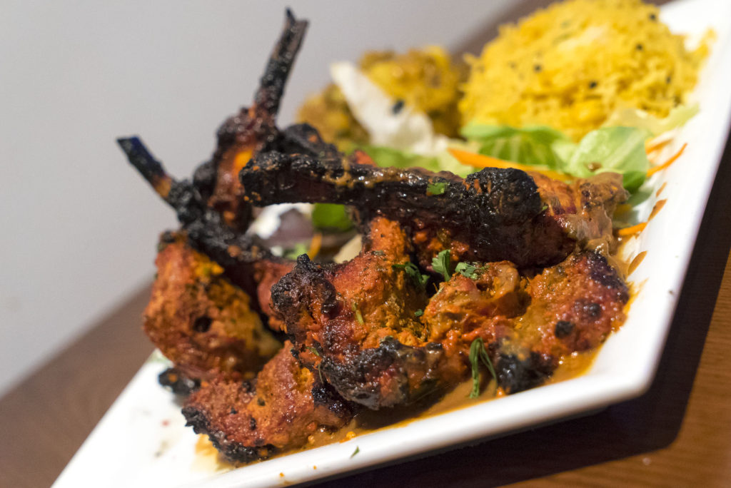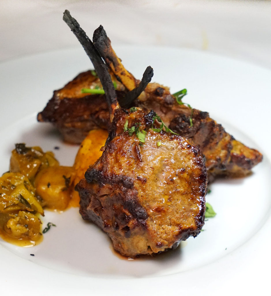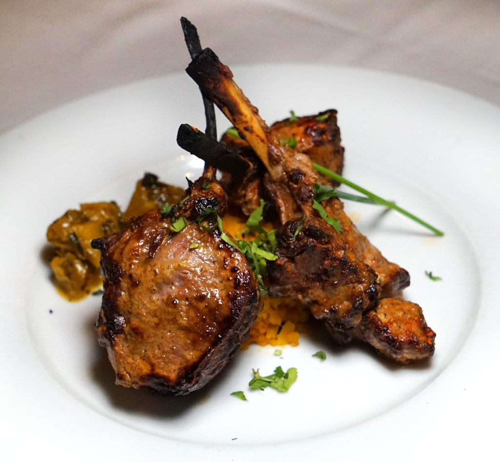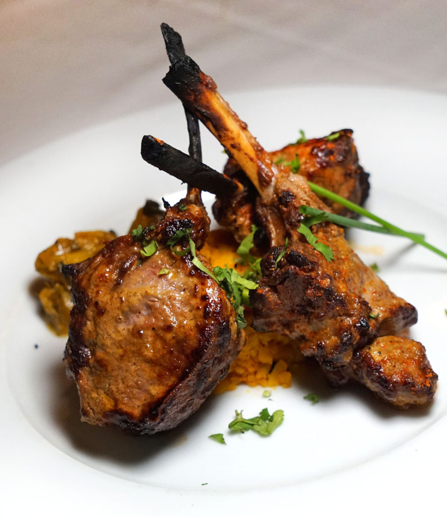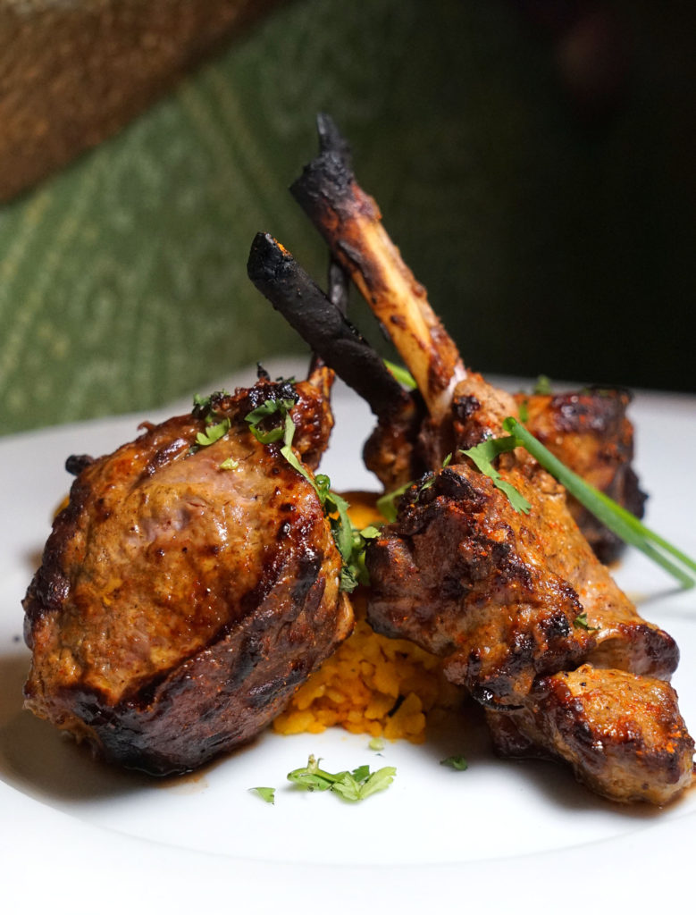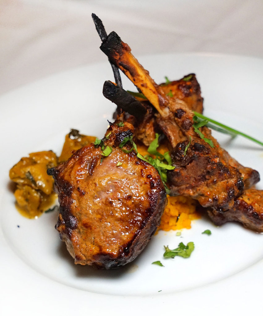 The chops have decorative foil on the bone in case you want to grab it like a man and skip the fork and knife. They’re marinated in Indian spices, red wine and herbs. They’re cooked thru, but tenderized so beautifully with a great char from the tandoor oven.
