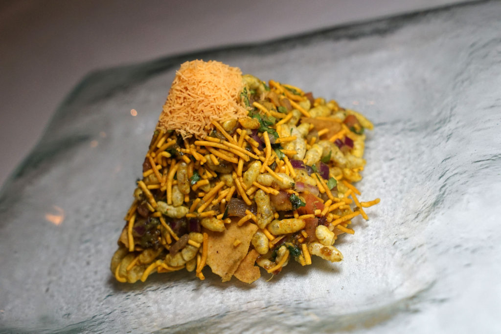 Bhal is brought out to each table before the meal. This is a savory street style snack made from puffed rice, shreds of fried chic pea, onions, spices, tamarind sauce and chutney. This stuff was absolutely addicting!