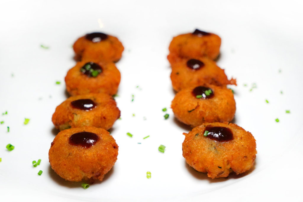 Above is a garam masala spiced pumpkin soup along with some blue cheese bread puffs (and a pair of our drinks). Below is the revealing of a nice fried beet root bite.