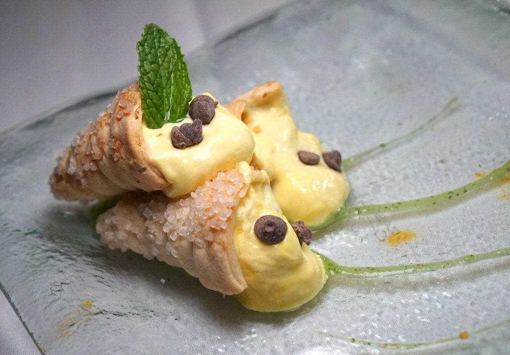 And he finished us off with a scoop of mango sorbet right there in the kitchen. Very nice.