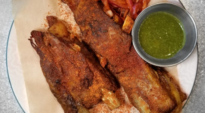 Our final entree was meen polichattu, which is roasted cod that’s wrapped in banana leaf with green masala. It comes with a side of diced, fried banana that serve as a starch element similar to a potato side. It had a nice high level of spice, was really tender and was completely devoid of any bones. Lovely!