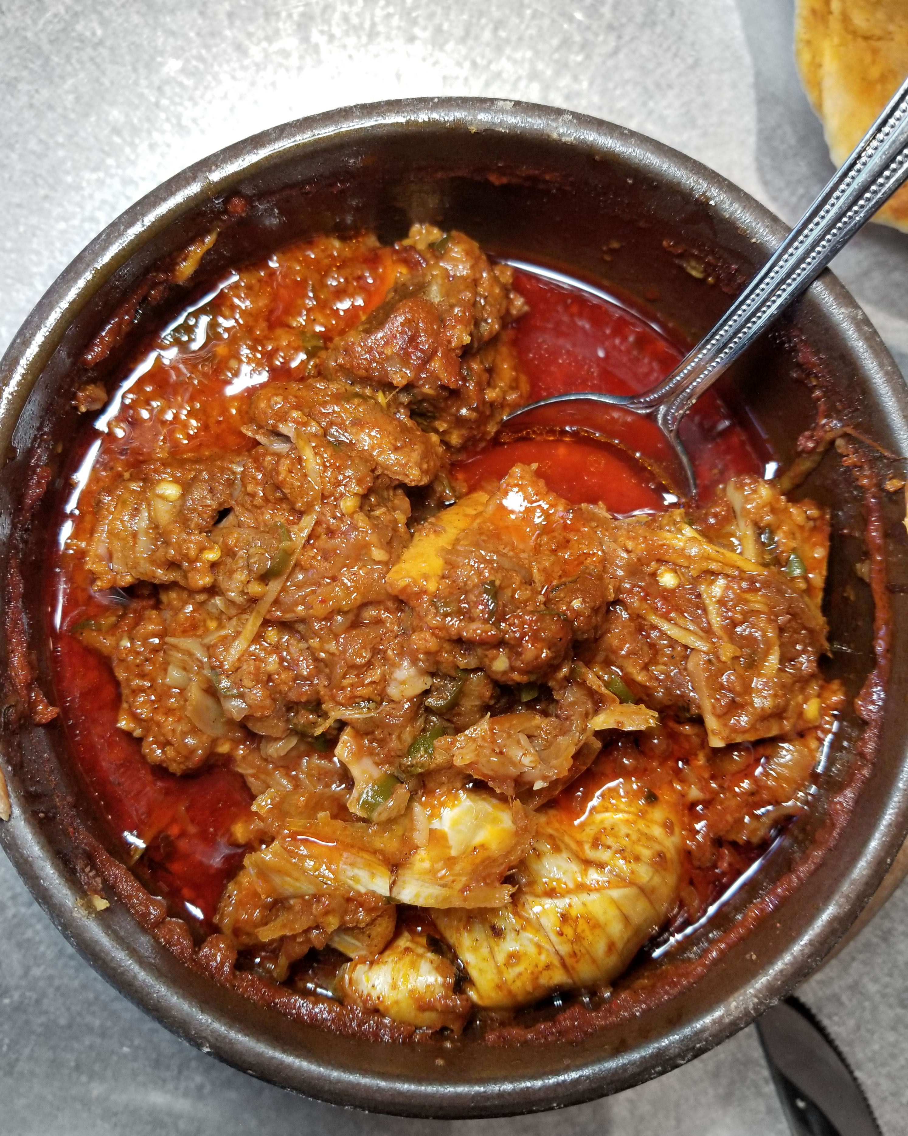 This first curry is kori gassi. It’s a spicy and savory Mangalorean (an ethnic group from the south western coast of India) coconut chicken curry. This was by far my favorite item of the night. It had a great, rich and salty flavor with nicely balanced heat. The chicken was perfectly cooked, super tender, and varied by cut (both dark and white meat portions).