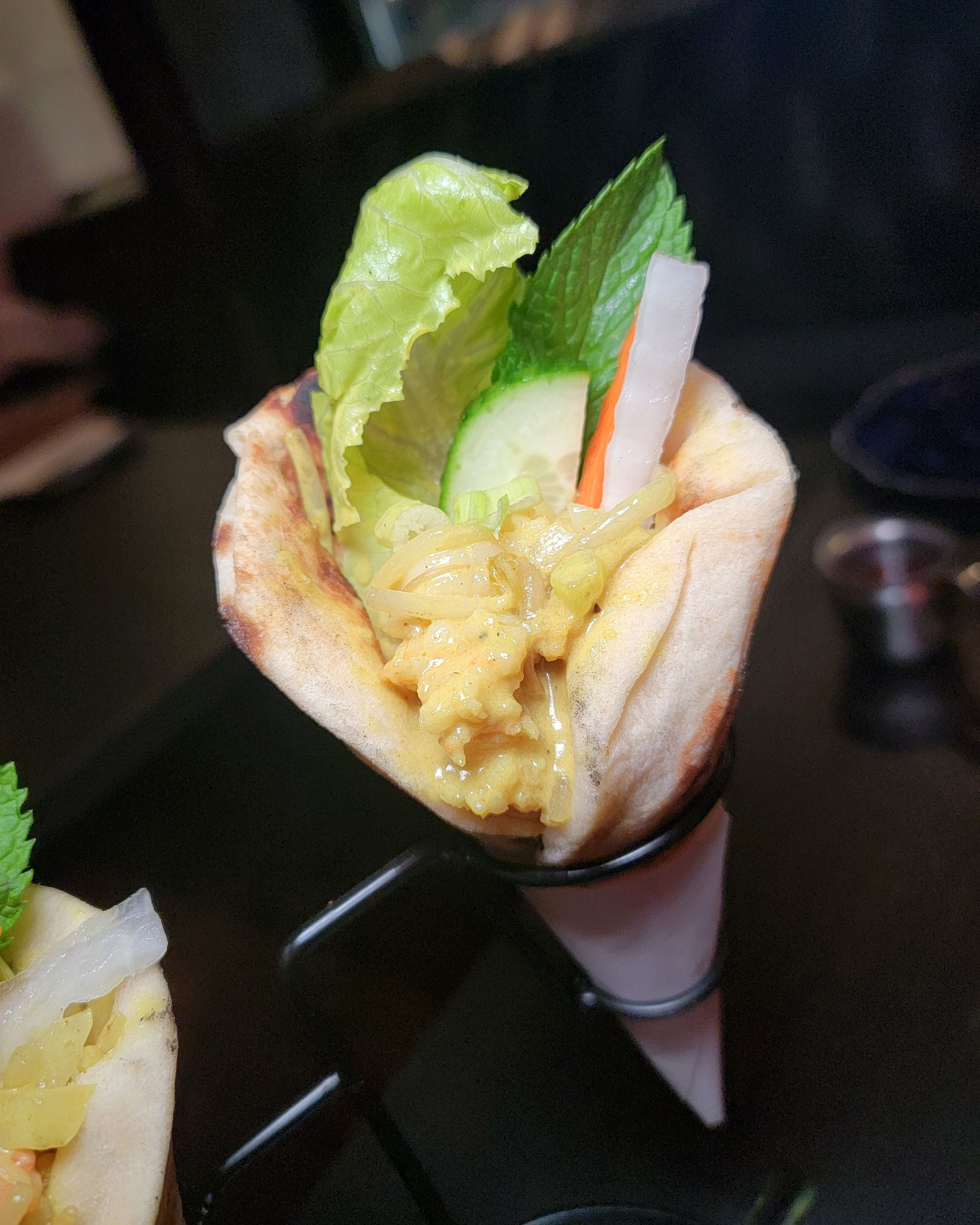 We started with their non-traditional take on banh xeo, which was more like a pita bread cone with all the flavors of banh xeo inside. It wasn’t bad!