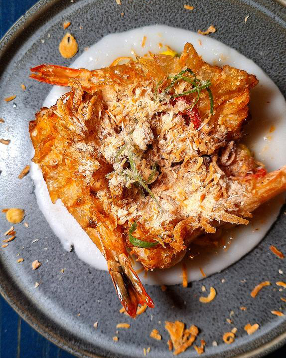 Crispy baby octopus with Thai lemongrass curry and fried Thai basil. Ask for a small bowl of rice so none of that curry goes to waste!