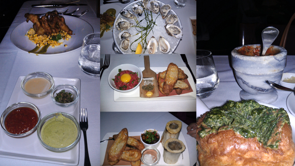 I ordered a deconstructed BLT with avocado and fresh mozzarella. The description said thick cut bacon was involved, but the app didn’t really deliver on the promise. I was expecting a slab type, not the kind you find on a burger at McDonalds. On the bright side, the crab cake was fantastic – mostly crab meat with a dusting of breading for texture. The creamed spinach was awesome: it was garnished with some shaved cheese and breadcrumbs to give it some separation and individuality. Each plate came with delicious fried onions as well. For dessert we tried the cheesecake (not too heavy – lots of good flavor), the apple crisp with ice cream (really nice, warm), and chocolate cake. The chocolate cake was the largest of the three in size, with the other two being somewhat smaller (probably because they were price fix items). I had a frozen hot chocolate, which was essentially like an ice cream/chocolate/caramel parfait with a vodka whipped cream that was made using liquid nitrogen. Delicious. On the second visit, we had the braised filet appetizer, which was great aside from the bland and slightly sweet polenta underneath. The oysters were ice cold and really crisp. The string beans were a little bland, despite being slathered with blue cheese and bacon. For dessert we had liquid nitrogen espresso mint chocolate ice cream. INCREDIBLY SMOOTH! Perfect way to end the awesome meal. On my third visit, we tried the cheesecake creme brulee (essentially a cheesecake with a brulee’d top), the lobster & crab fontina cheese fondue (nice and creamy, tasty), and the chili pop shrimp (best app on the menu – crunchy tempura batter with a sweet spice kick). On the side we got to try the GM salad, which was pretty good, though not as fantastic as they make it out to be. We also had sauteed spinach and mashed potatos, which were both solid choices. Fourth visit: see some seafood apps in the below section, but we also had a flavorful butternut squash soup, the baked mac & cheese, which was really creamy and crisp on the top, duo of chocolate and vanilla creme brulee, and an amazing liquid nitrogen chocolate ice cream that tasted almost like frozen pudding (along with a complimentary birthday cake for the birthday girl). See the pics below: