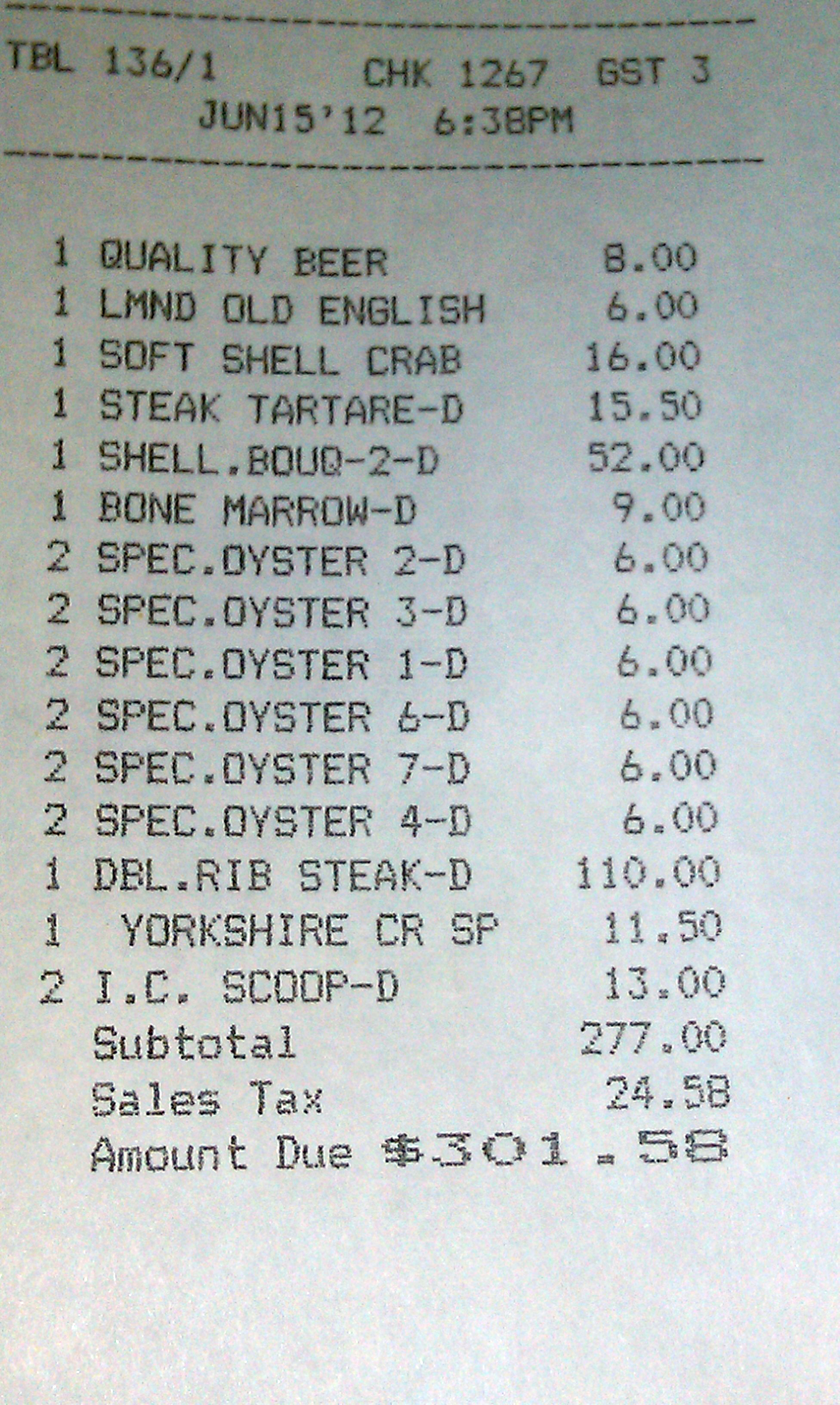 Our total bill came to just over $300; not bad at all. To top it off we had a $100 gift card from spending so much money with our AMEX card. POINTS = MEAT! Otherwise the steaks are average priced, with the double ribeye being a bit more per person than a normal cut of meat. We ended up paying about $255 for everything, with the tip included and the $100 deducted. Check out the breakdown of the original bill below: