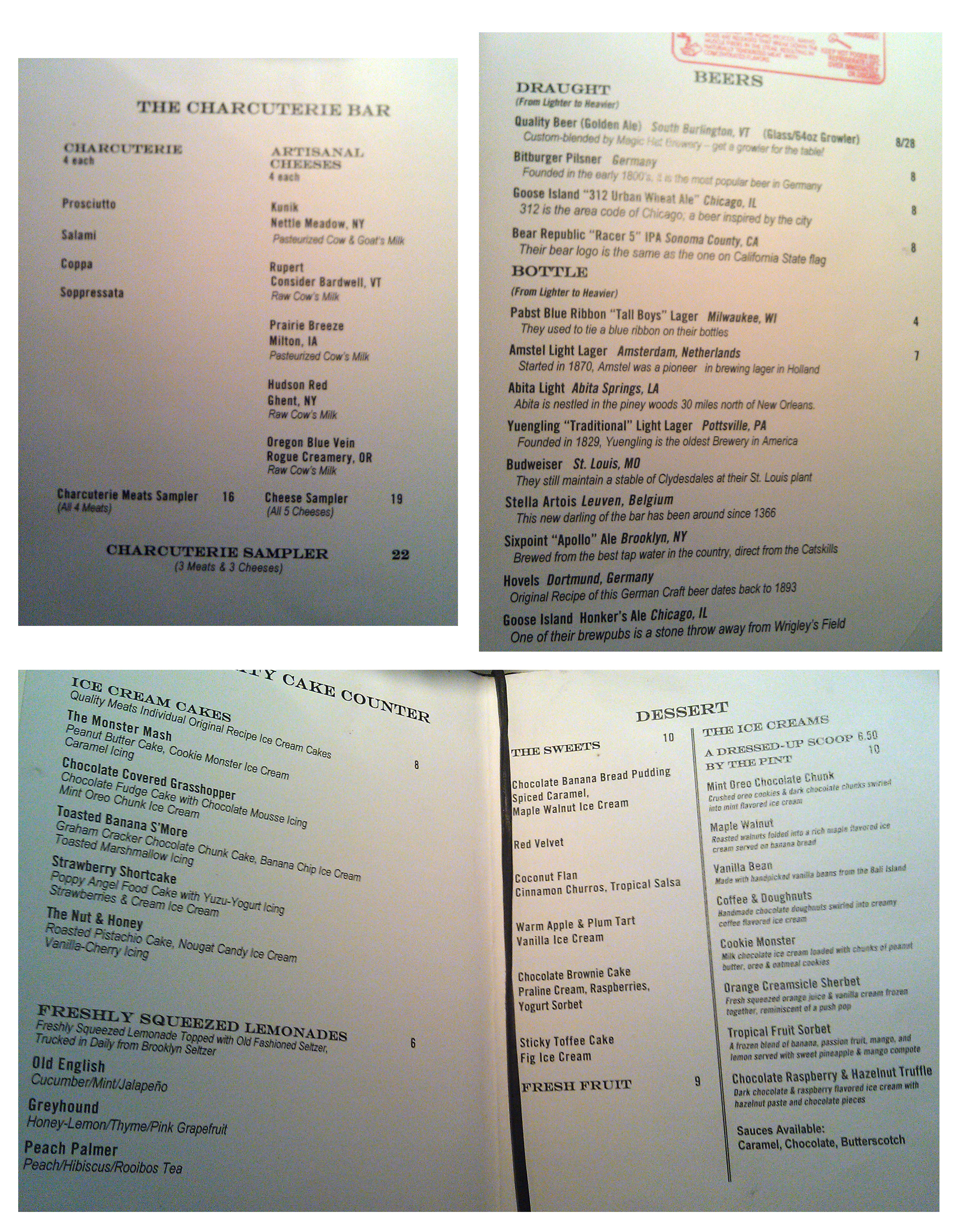 The bar was a lot more “hopping” than I thought it would be. A solid crowd despite it not being a big bar. The bar itself has a white marble top, and it feels like you are at a butcher’s counter. They made a good martini with three pit-in Castelvetrano olives skewered as garnish; my favorite. They also had a great selection of whiskeys and bourbons. The bartender was very friendly, and he even tried his best to make a Pimm’s Cup for my wife despite not having all the required liquors to make it. Quality Meats also has a bunch of great beers. They offer some good old fashioned cans of PBR, as well as some higher end beers; a good mix. I tried a “Quality Beer,” which was a nice, round, non-bitter, amber colored beer specially brewed by the Magic Hat company. They also keep a truncated drinks and desserts menu by the bar for ordering booze, desserts or charcuterie (a nice selection of four different cured meats and four different cheeses), which is the same menu they give you for dessert. Despite all of this awesomeness, I just can’t see myself hanging out too often at the bar here.