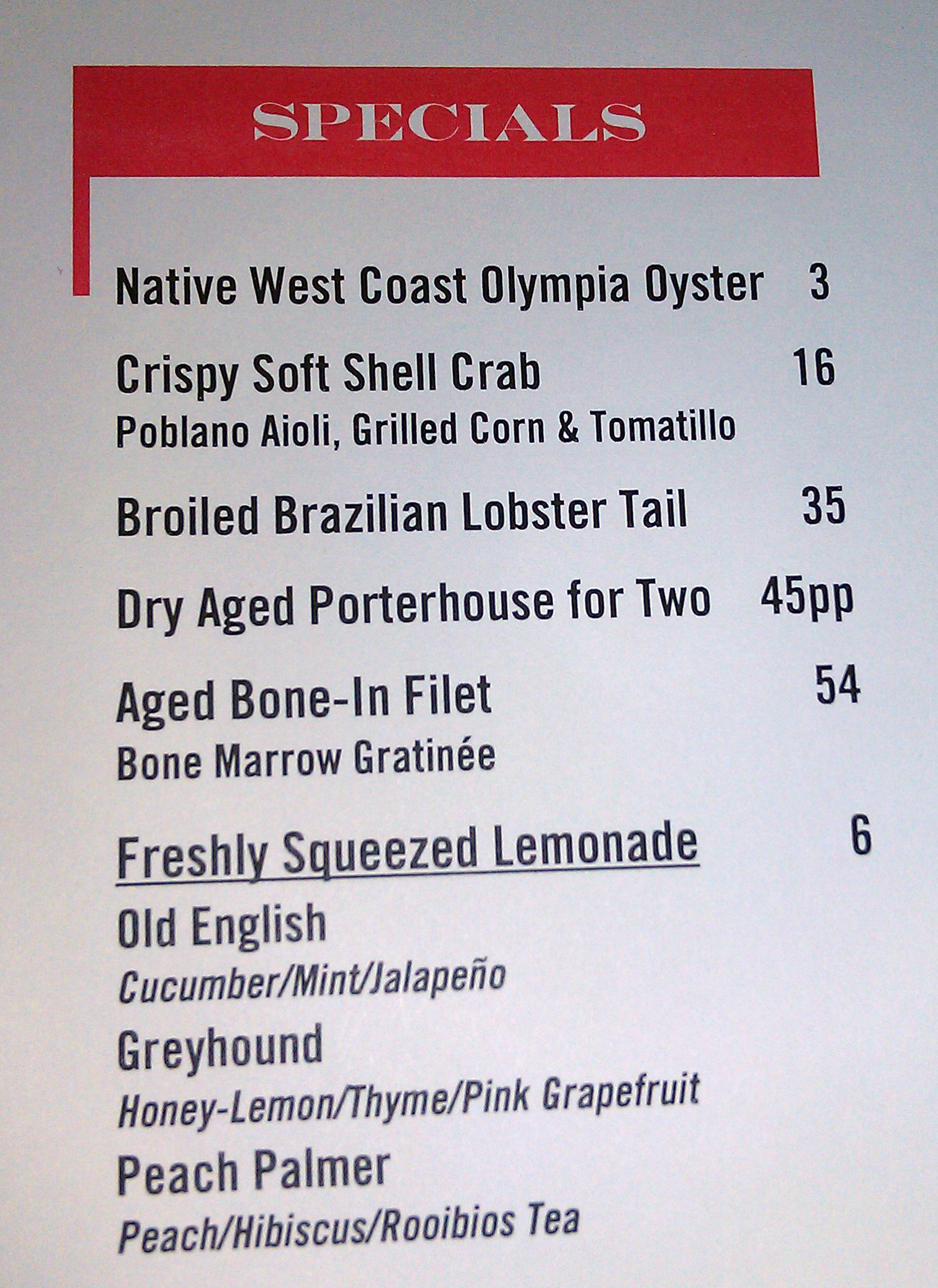 On special for beef they had a porterhouse for two, and a bone-in “filet.” They also had a soft shell crab appetizer, which was delicious. Light, golden, and crispy. They also had a Brazilian lobster tail (a lobster tail with no vagina hair) and an “Olympia” west coast oyster. As far as other meats go, they have a veal chop, roasted chicken, baby back ribs, and roasted veal shank for two. Perhaps a pork chop or a lamb dish would round this out better. Maybe make it a lamb shank or lamb chops instead of a second veal dish? In any case – a great showing on the beef specials here helped to bump the score up for choice of cuts available.