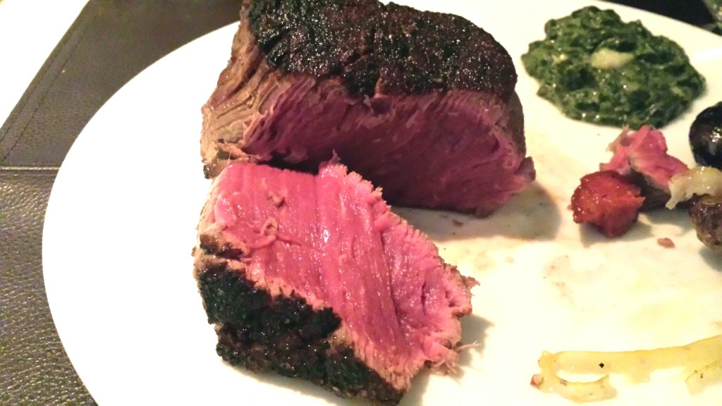 The meal kept getting progressively better. The steaks came out. three of us got rib eyes, and one of us got a filet. Let me start with the filet: I retract all comments previously made about filets being for pussies and broads. When my buddy was ordering his filet, I heard him throwing around words like “bloody” and phrases like “black and blue” and “cold inside.” I think he even suggested they just torch the outside to get a crust, and bring the thing over still pulsing in the final clutches of life. So when it came over I was interested to see how it looked.