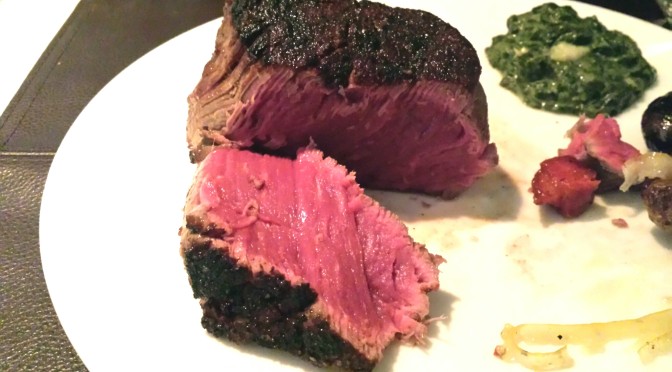 Looks marvelous! I had a bite. Best filet to date, and I am not exaggerating just because I had three martinis. From now on I am ordering my filets this way. Awesome. Juicy, flavorful, soft, well seasoned.