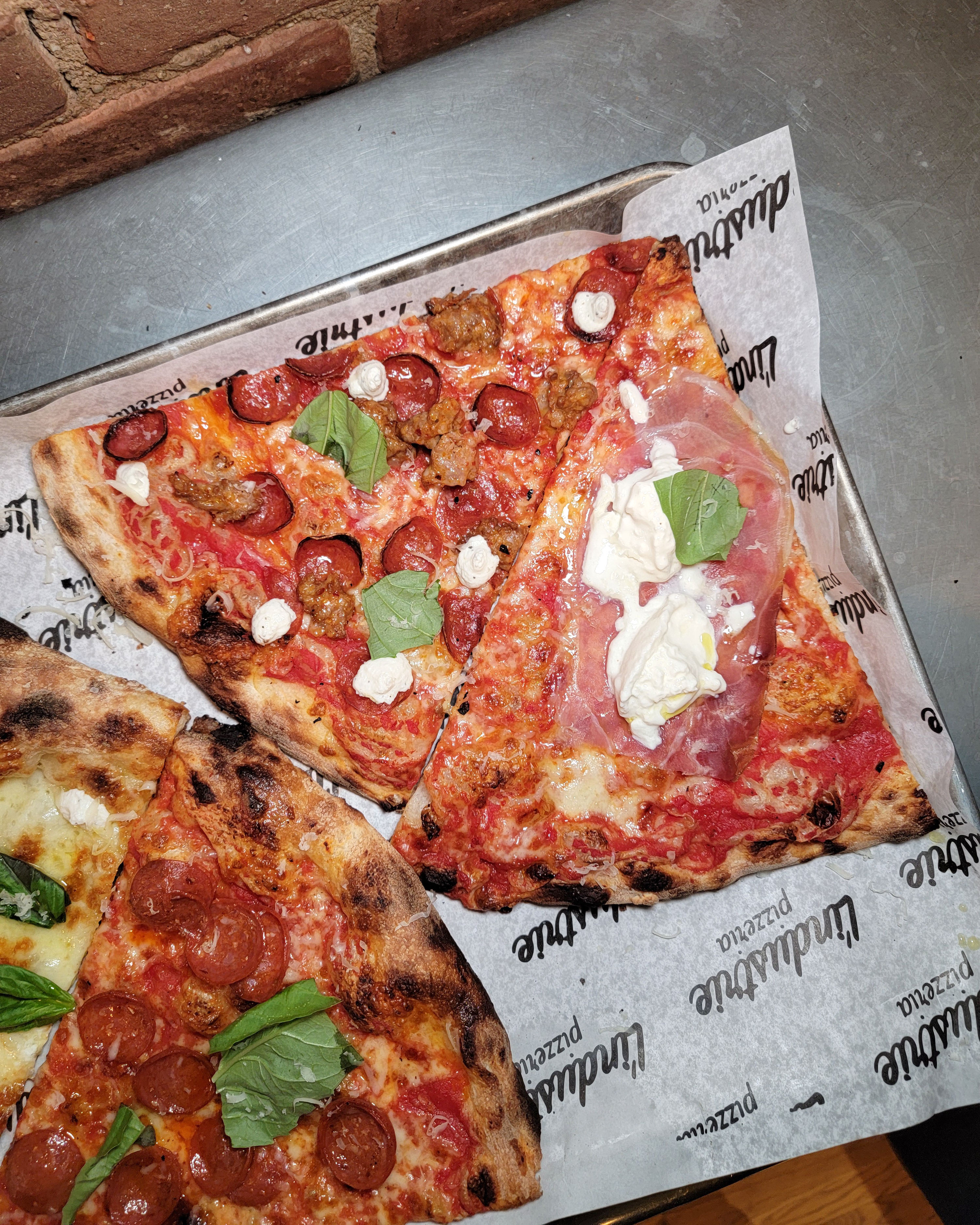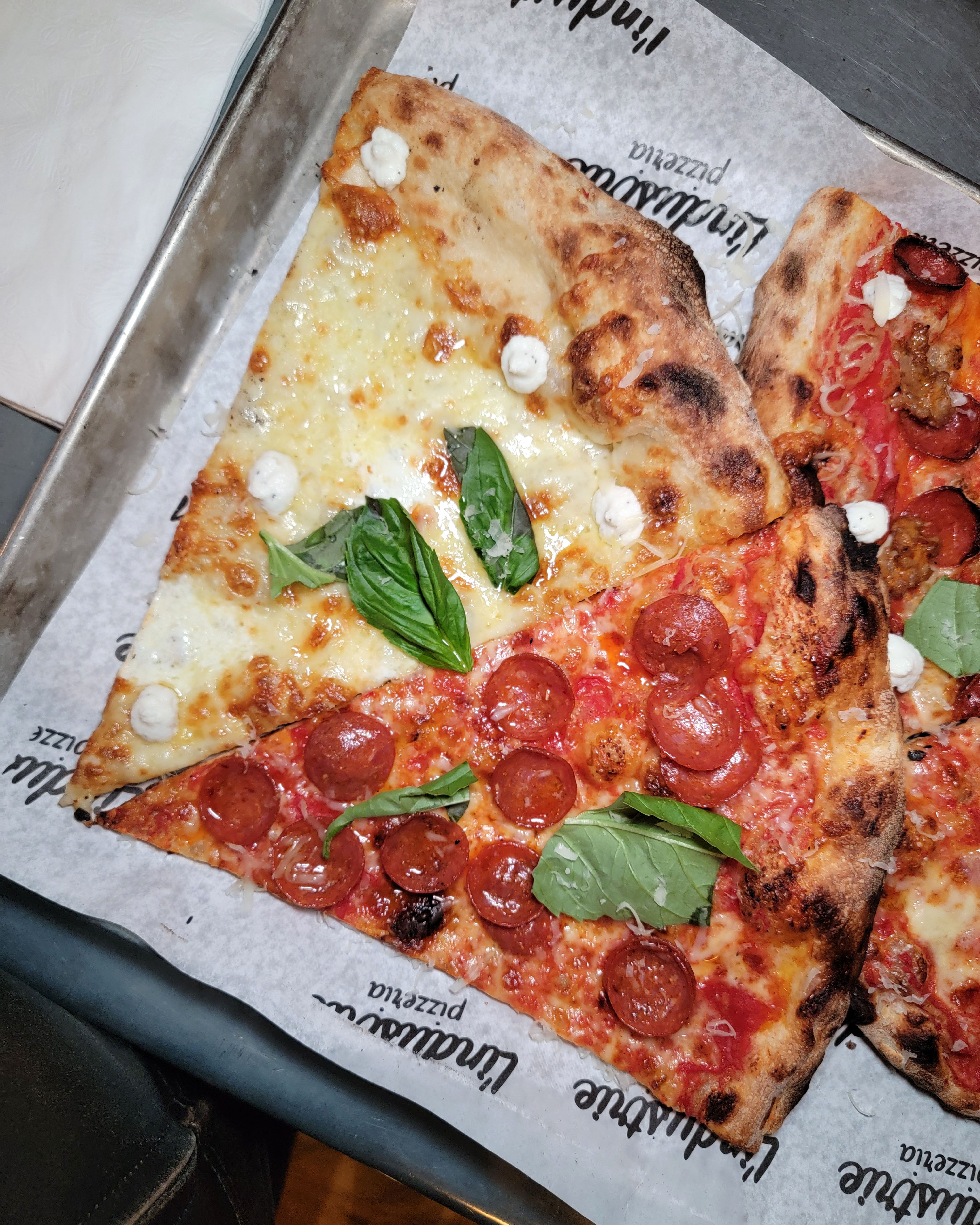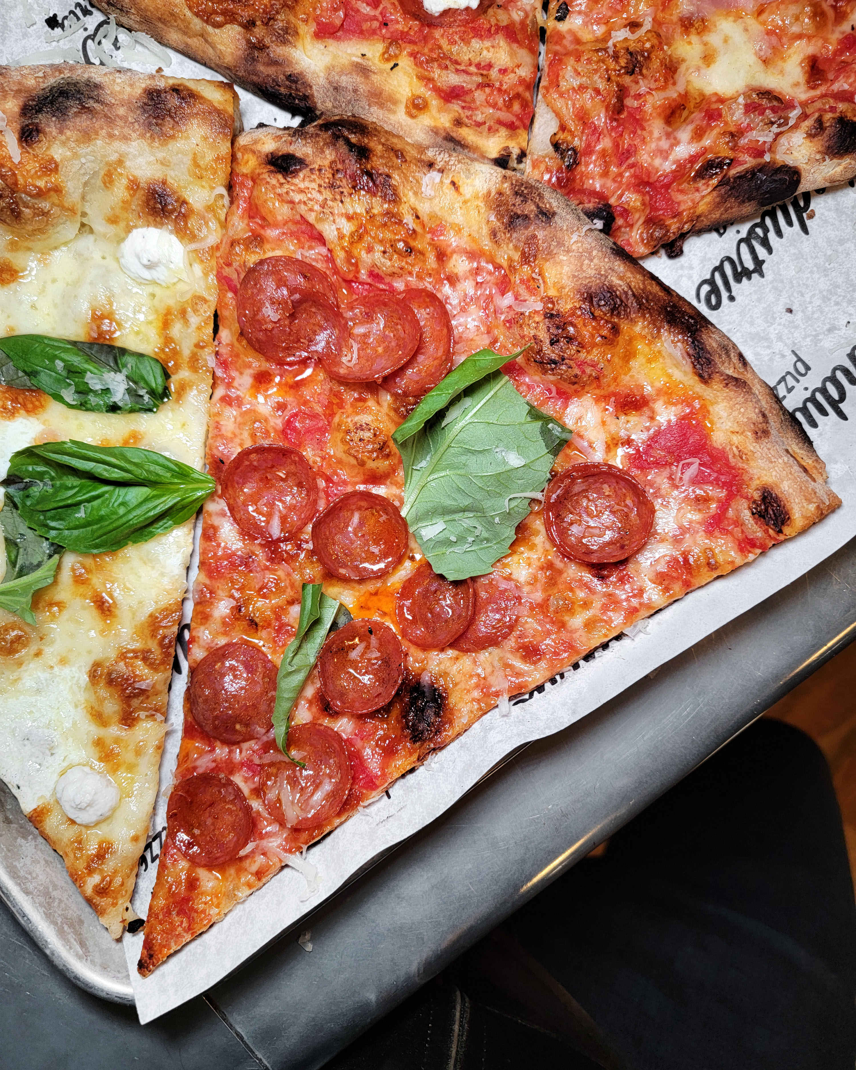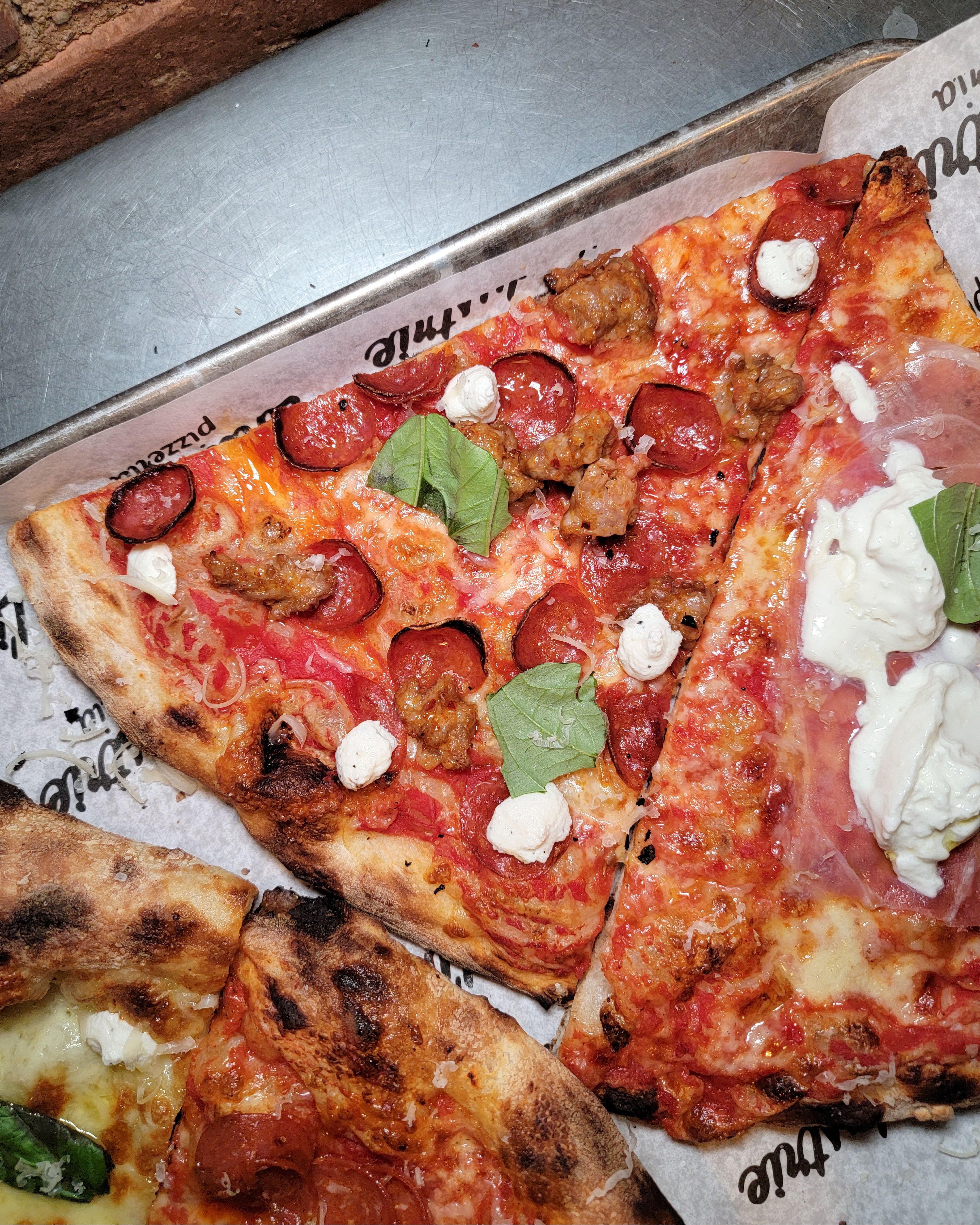 We tried a pepperoni, sausage and burrata slice; a fig jam, balsamic, arugula and burrata slice (named the “L’Industrie” slice); a regular pepperoni slice; and a white slice.