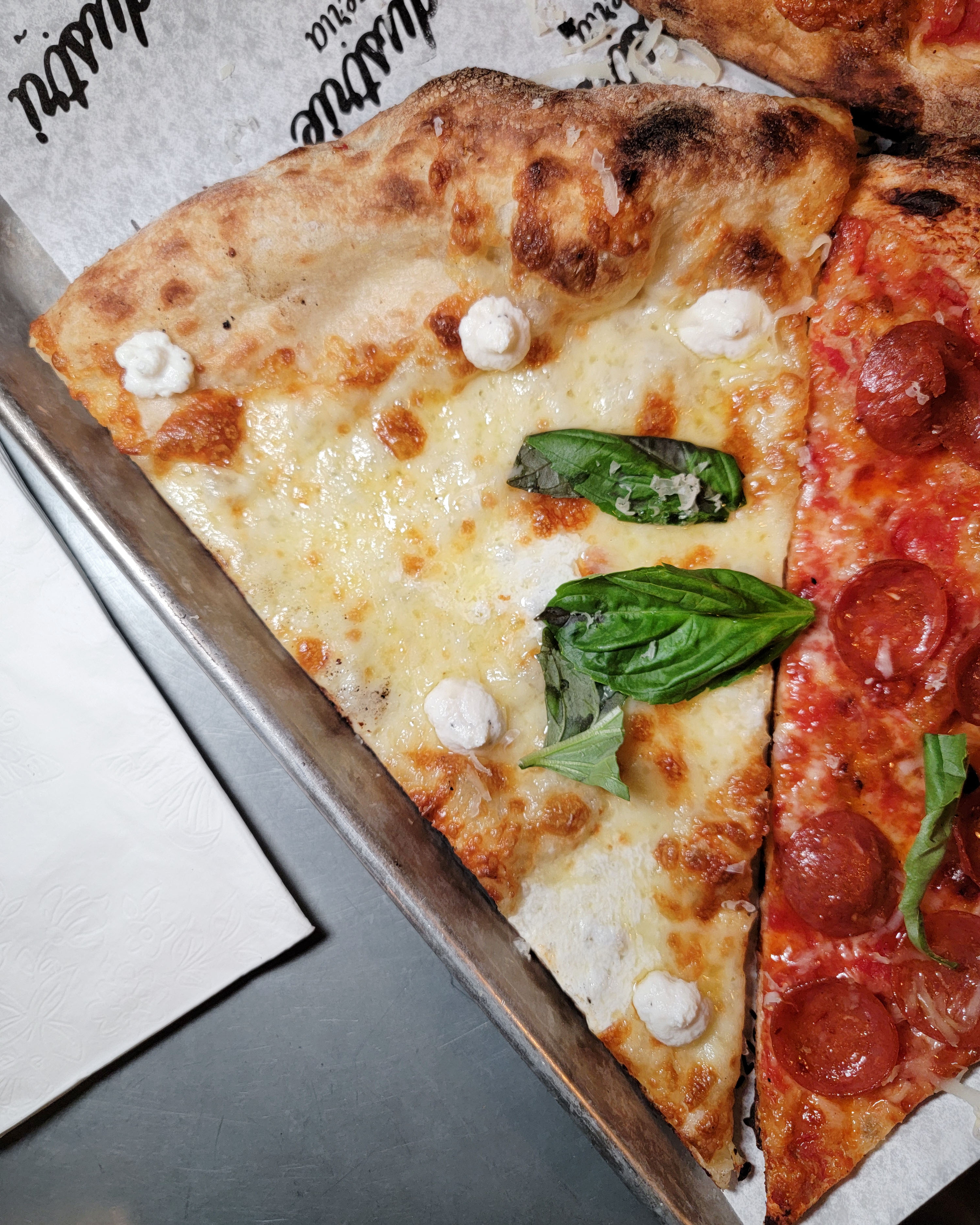 I tried the pepperoni slice, and the “fire and ice” slice. I think I preferred the “fire and ice,” which seemed to be fresh burrata and Calabrian chili “bomba” style sauce. Incredible! Great crust, no flop, quality toppings.