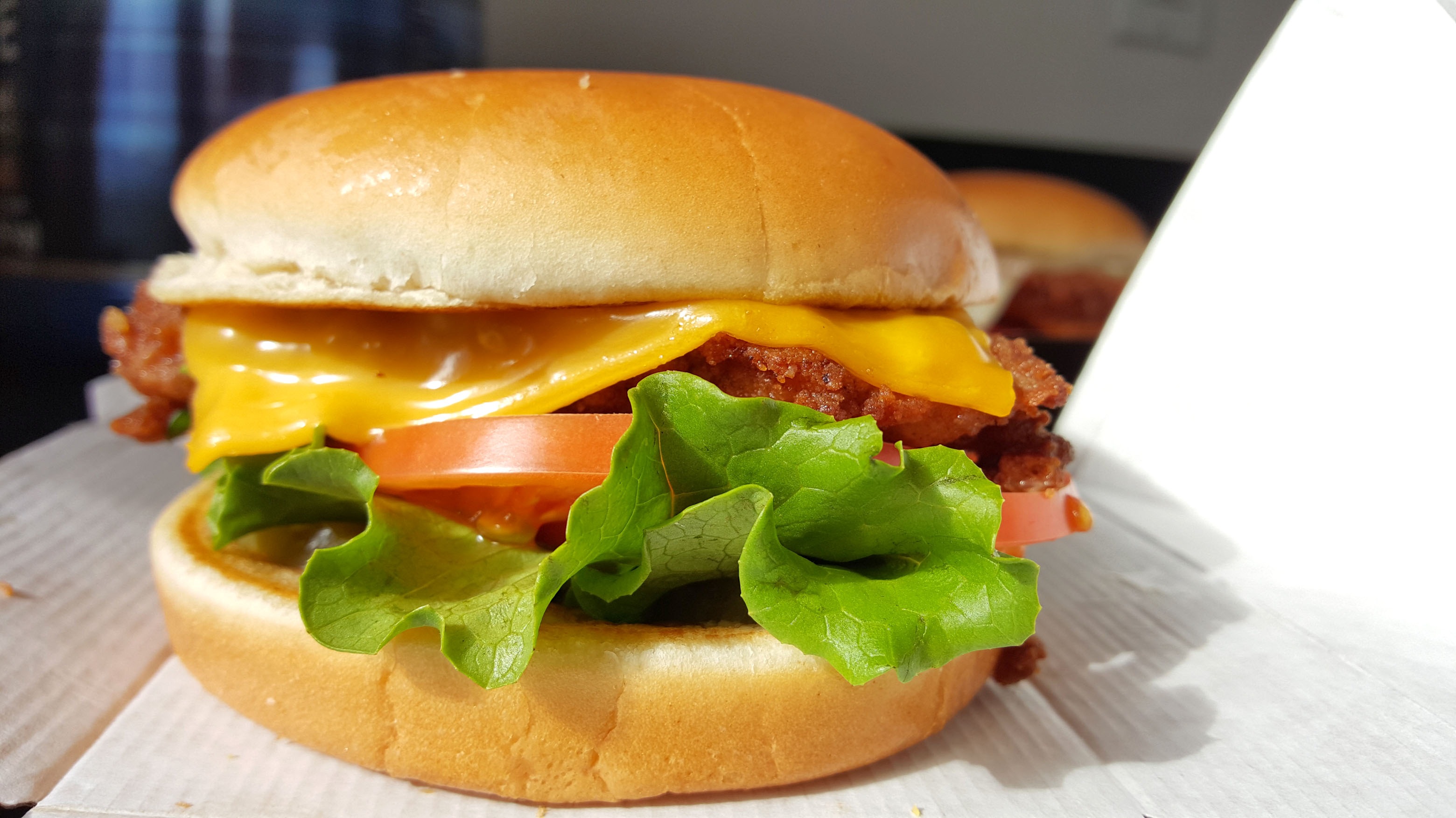 The spicy sandwich with a spicy breading, pepper jack cheese, lettuce and tomato: