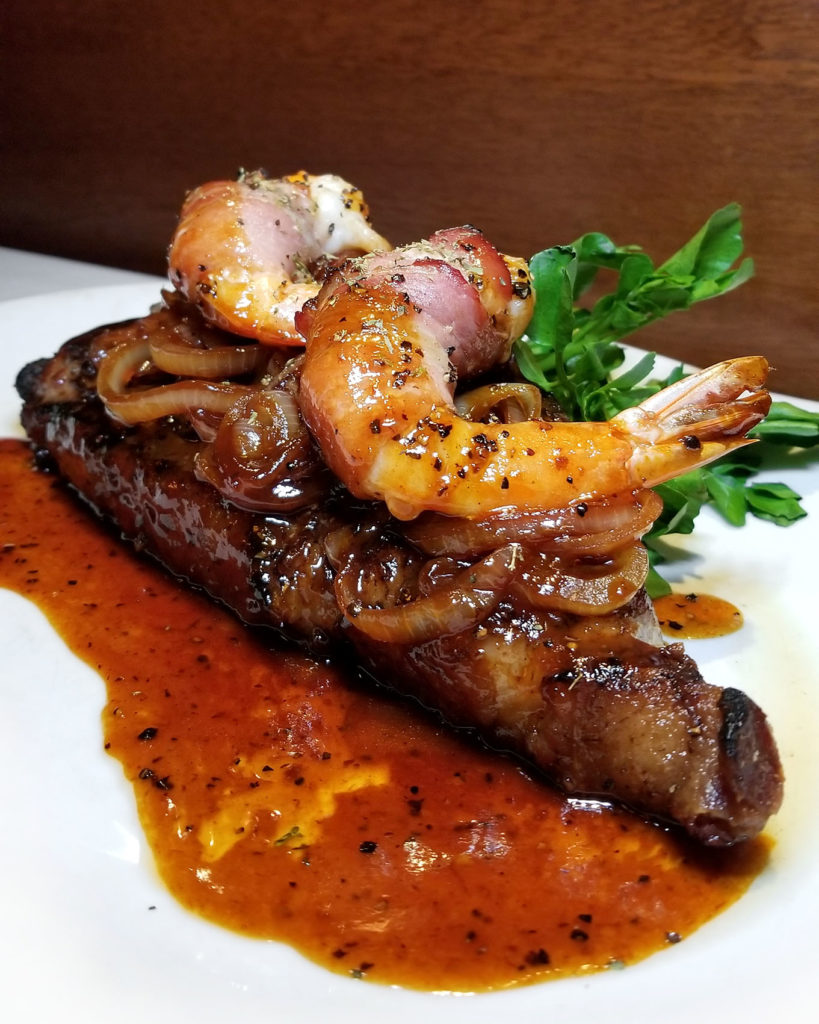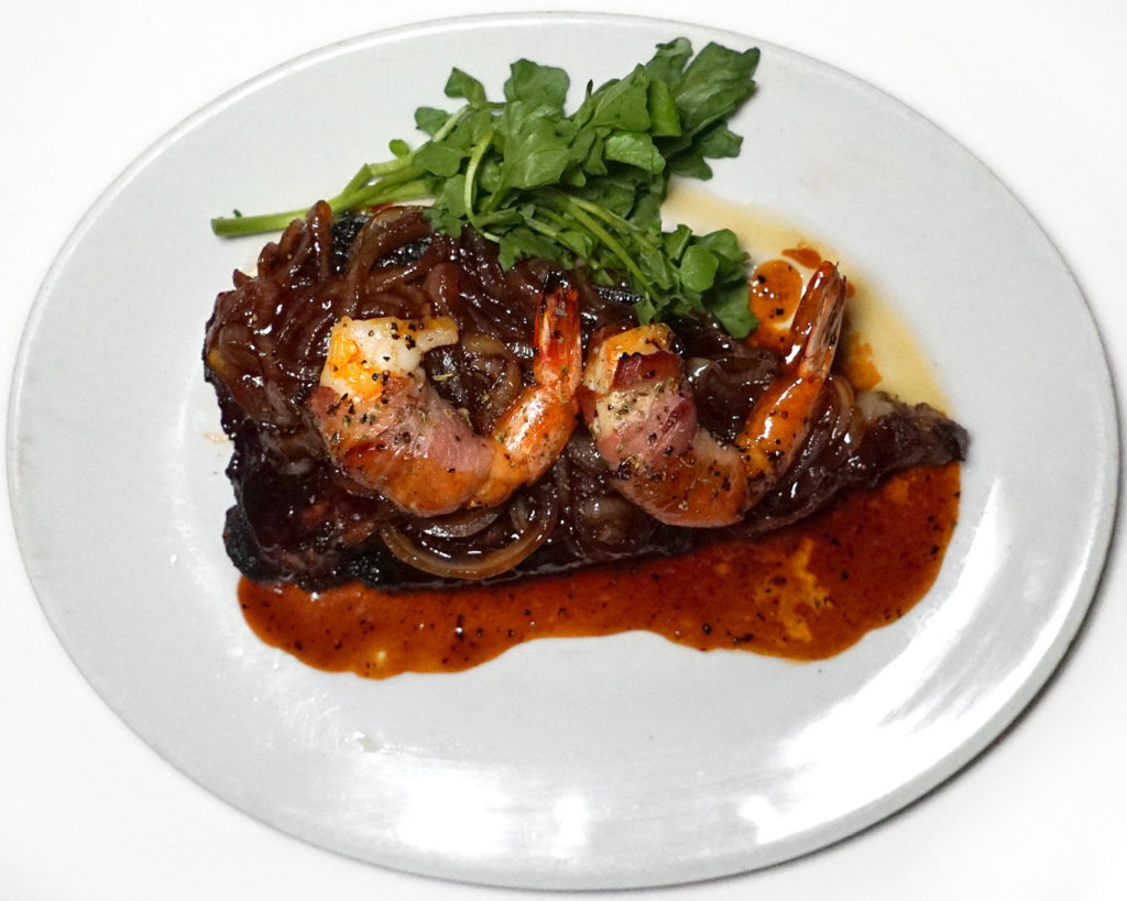 A special strip, topped with onions, sauce and bacon wrapped shrimp: 8/10 – would have been higher if not for the sauce and onions.