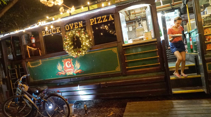 Nope. This was just a big failure. We likened it to Boboli. We were better off hitting Denny’s for our late night NYE food binge. The setting was cool enough, with a re-purposed trolley car as the kitchen, and large, old, wooden cable spools as tables.