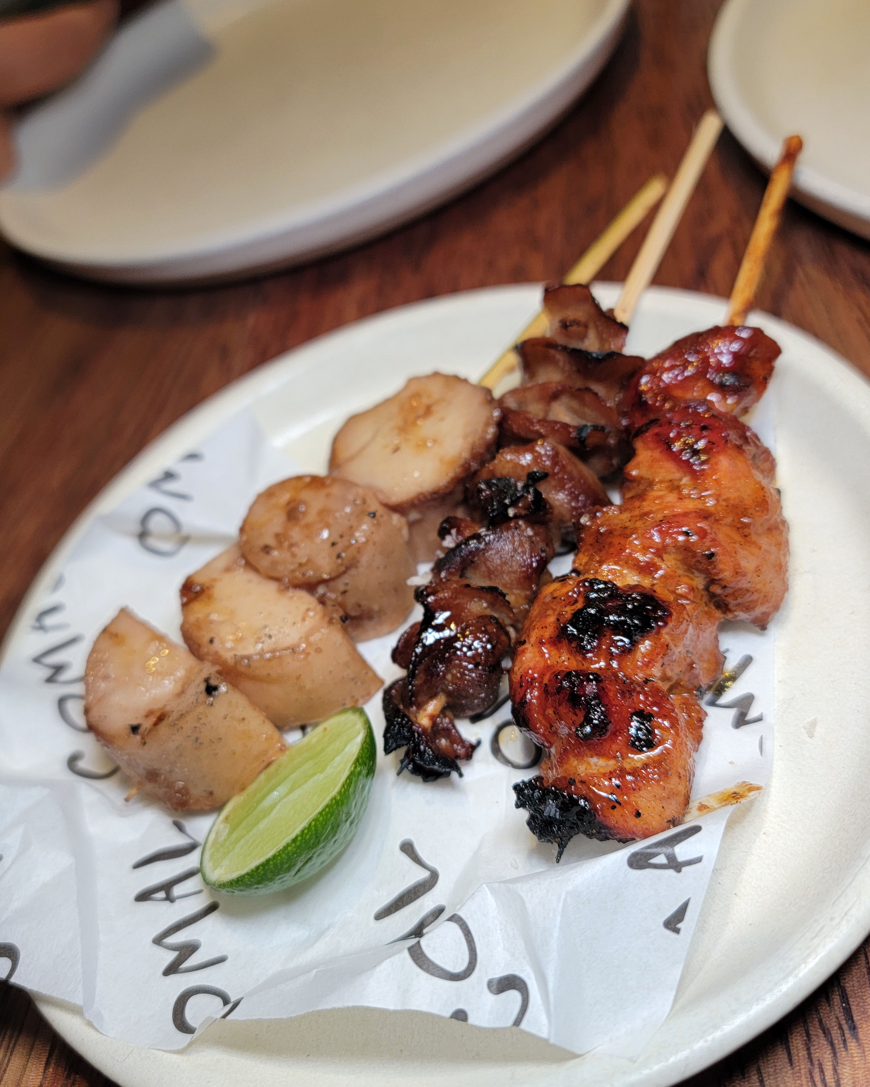 We started the meal with three skewers: al pastor chicken, beef tongue, and mushrooms.