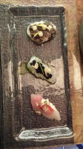 Next was the trio of crudo for $12. We picked amberjack (delicate, but with a little kick of chili and shallot), fluke (a little tougher to chew, but clean/crisp, and topped with caviar), and the scallop (soft and buttery, with a great truffle puree beneath).