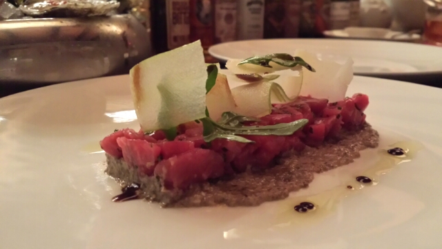 Then a steak tartare. Yes – this was only $11 on the bar menu. It’s like a full-sized app! It was diced a bit too large for my liking, as some pieces remained chewy, but it was packed with earthy flavor due to the mushroom cream at the bottom. This was served with a little plate of cheese chips as well.
