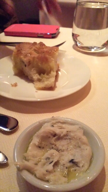 Everyone here was incredible. Our waitress, Amber, was wonderful. I felt really bad when the wrong item came out to the table (strip instead of rib eye), and for a second I almost considered just sticking with the strip.. but I HAVE to try rib eye to rate a steakhouse fairly. When they said we could keep the strip anyway, I was blown away. What an incredible attitude to have towards customers! There was no way my wife and I were going to finish all that meat, so we ended up giving our leftovers to a hungry war veteran who was begging for FOOD, not money, on the subway. I figured it was only fair to give away what I did not pay for. The people at Costata, I’m sure, will be happy to know that the misfire of the strip ended up helping someone in need. When someone is asking for food, you KNOW they are not trying to scam. I hope she (the veteran) enjoys the wonderful meal we gave her. I’d say it was about 14oz-16oz of strip and rib eye, plus nearly a full sized side of creamed spinach. OH – I have to mention the table breads here too – they served rosemary flavored focaccia bread with a small dish of garlicky lard instead of butter – SWEET!