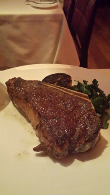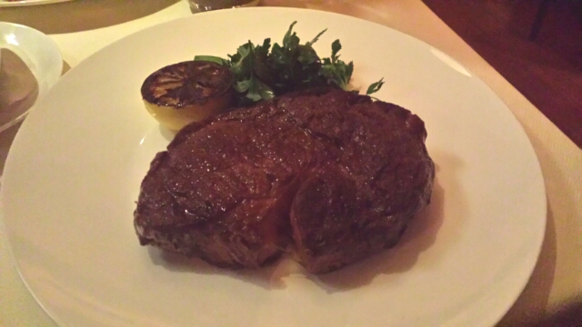 I ordered the boneless rib eye, however when the entrees came out, they delivered me a bone-in strip. Doh! I was gearing up for a rough experience, so my wife and I started digging into her lamb chops to get started. The manager, Adele, came over to the table with the strip in hand and said, basically, that since it was already cooked, we could just have both. WHAT!?!??! I felt so terrible, not to mention I am trying to count calories on a new diet. But how could I resist? I accepted the gift of beef and started chowing on the strip while waiting for the rib eye. The flavor was incredible. I got halfway through the strip and had to hold myself back to save room for the rib eye. But when the rib eye came out, it was like next level shit. Perfectly cooked. And the lamb was pretty incredible too. I hold back from a full score of 10 here simply because there was some gristle type fat that was too rugged to eat, but for the most part the fat was very melty and jelly-ish, even on the edge of the strip, which really surprised me.
