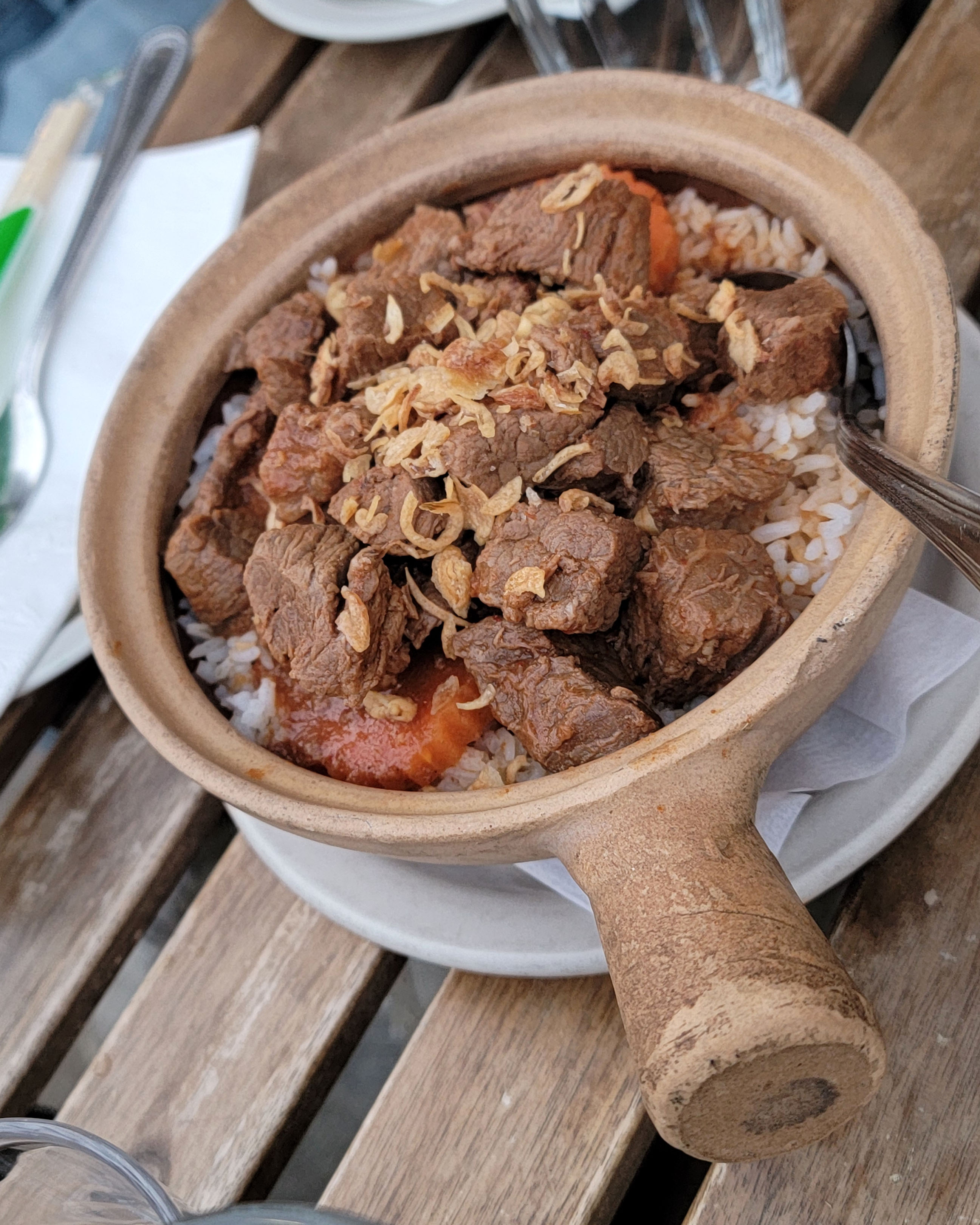 The clay pot beef stew wasn’t hot enough to crisp up the rice on the bottom of the serving vessel (which wasn’t really hot), but it was tasty and came with a side of veg.