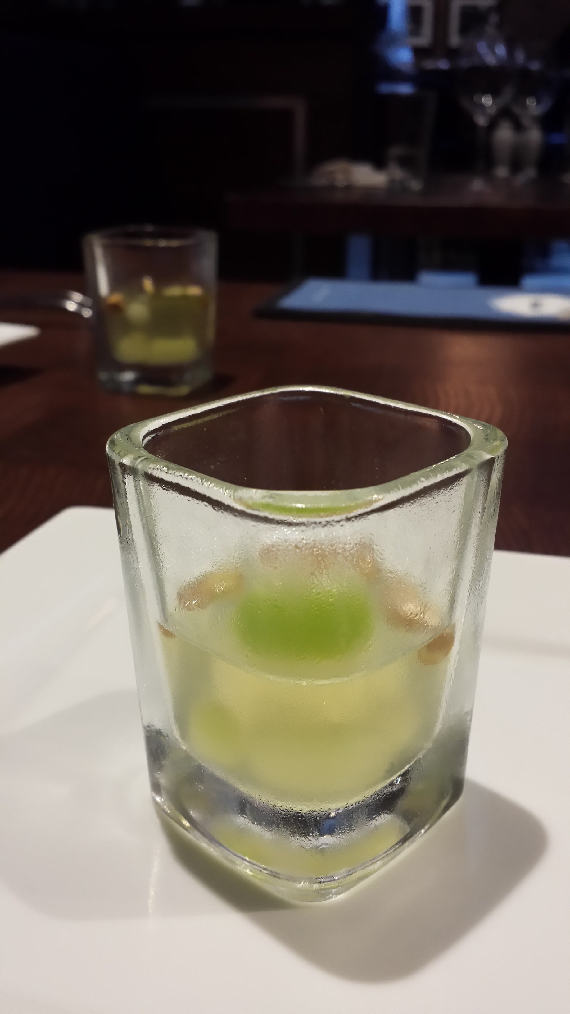 When we sat, the waiter brought out a little shot of strained cold gazpacho; tomato with melon. Very refreshing.
