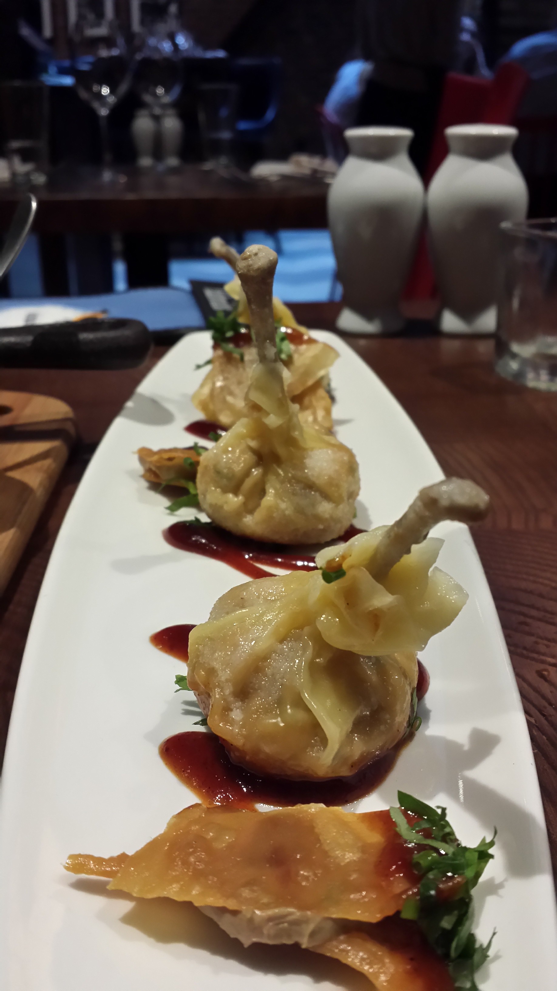 We started with a pair of apps. First was the “skin and bones,” which was essentially chicken liver pate sandwiched between two pieces of crispy chicken skin, and served with chicken dumplings drizzled with vindaloo sauce. The cool thing about these dumplings was that they were “bone-in.” The chicken bones were little handles to grab the dumplings. Observe: