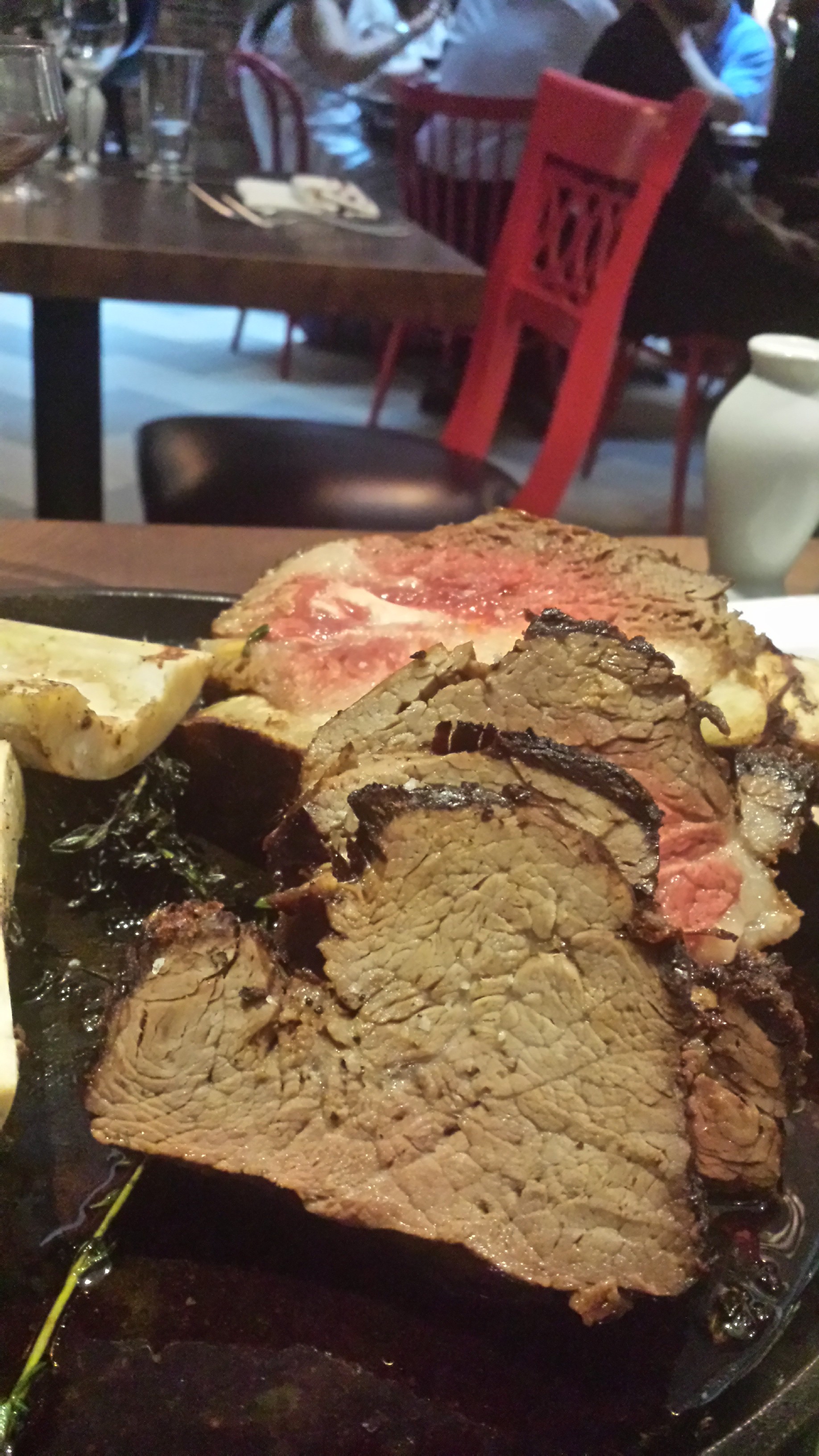 I kid about the hiding. But, yeah… It turns out that the rest of the steak was really well done. We ordered it medium rare. I guess with these big hunks, lots of chefs have trouble getting an even cook across the meat. The bone still had blood on it. It certainly was an awkward size and shape. What a shame. When it’s done properly it is probably an incredible meal.