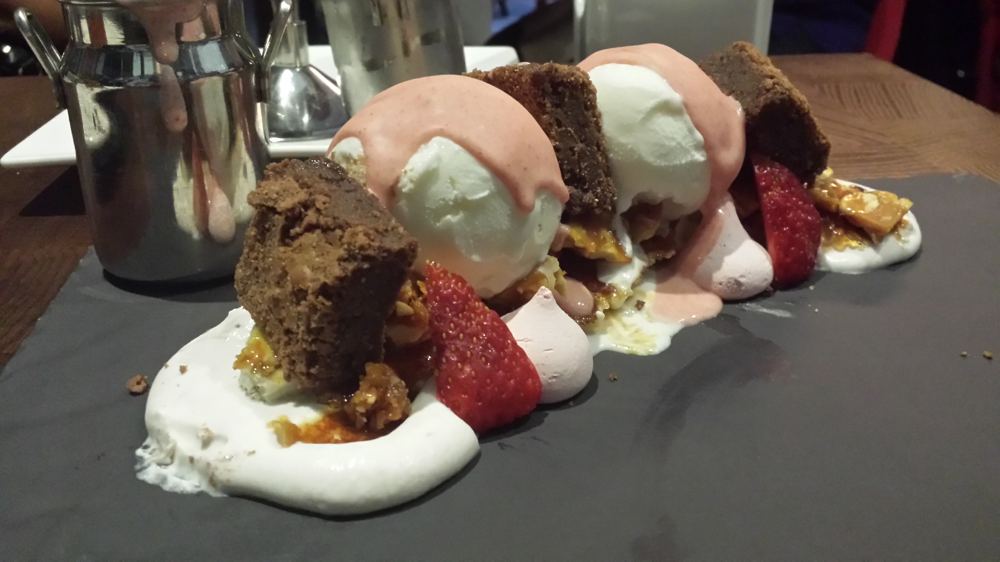 We also had the frozen yogurt banana split. This was pretty good. The fro-yo was actually delicious, and the pink stuff you see is the sauce that was poured over and then hardened into a shell. Magic Shell!?! Total blast from the past. The banana was just so-so; maybe a little under-ripe. The brownies weren’t really needed, I don’t think.
