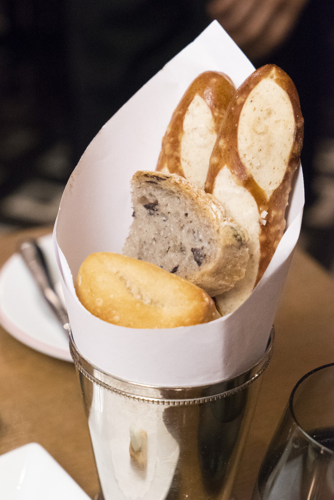 Let’s back up now. We started with some cocktails and table bread, which had an assortment of pretzel bread, olive bread and dinner rolls.