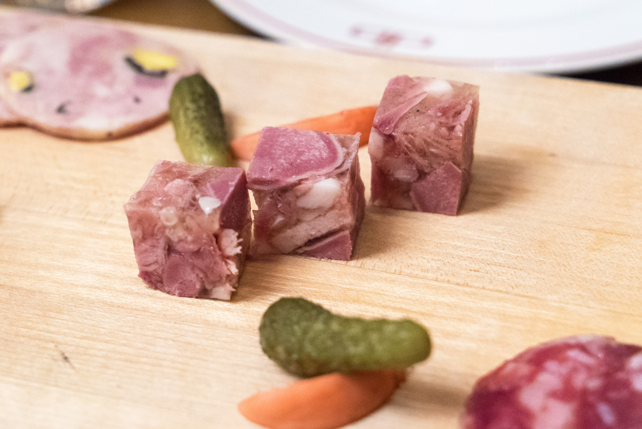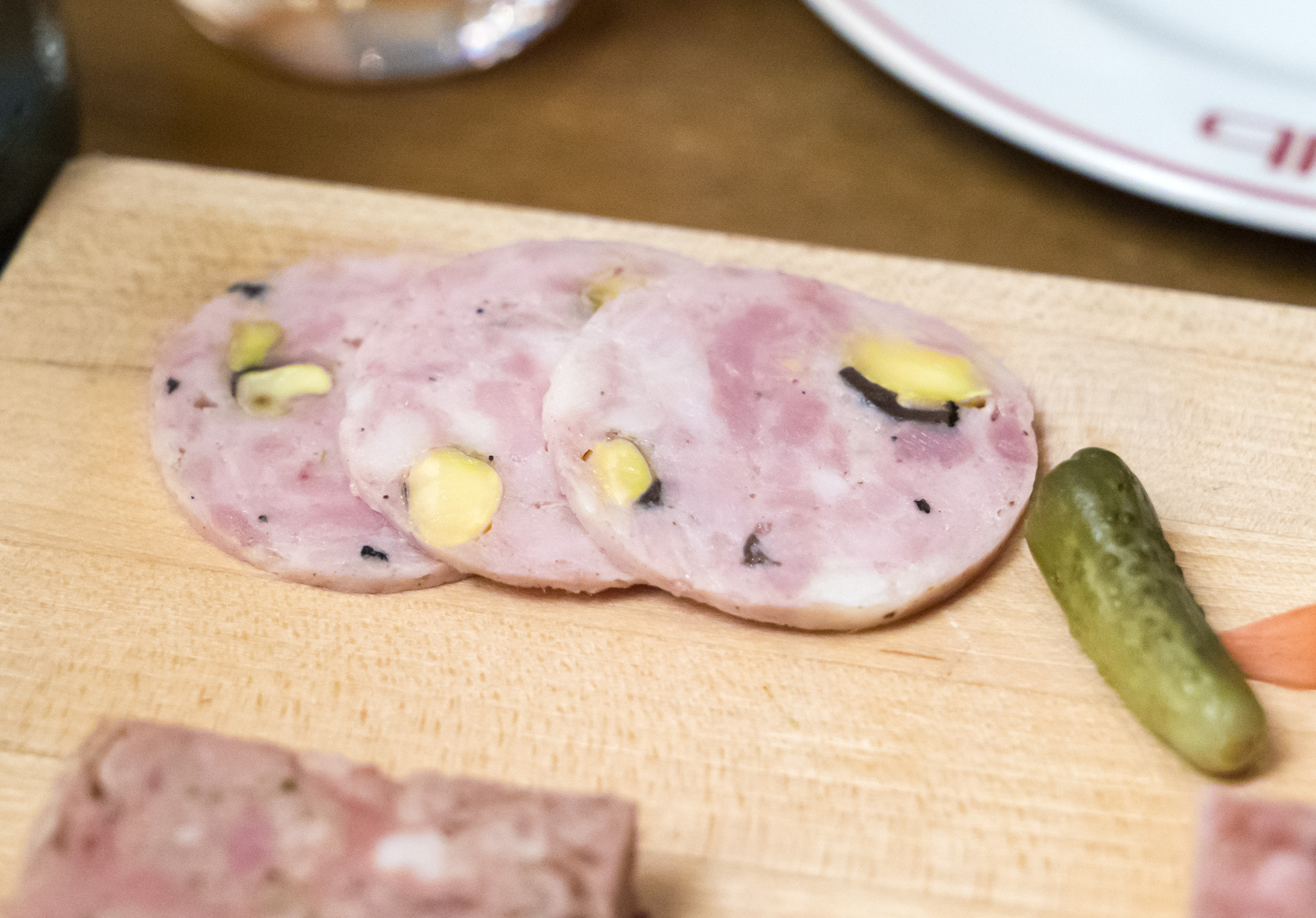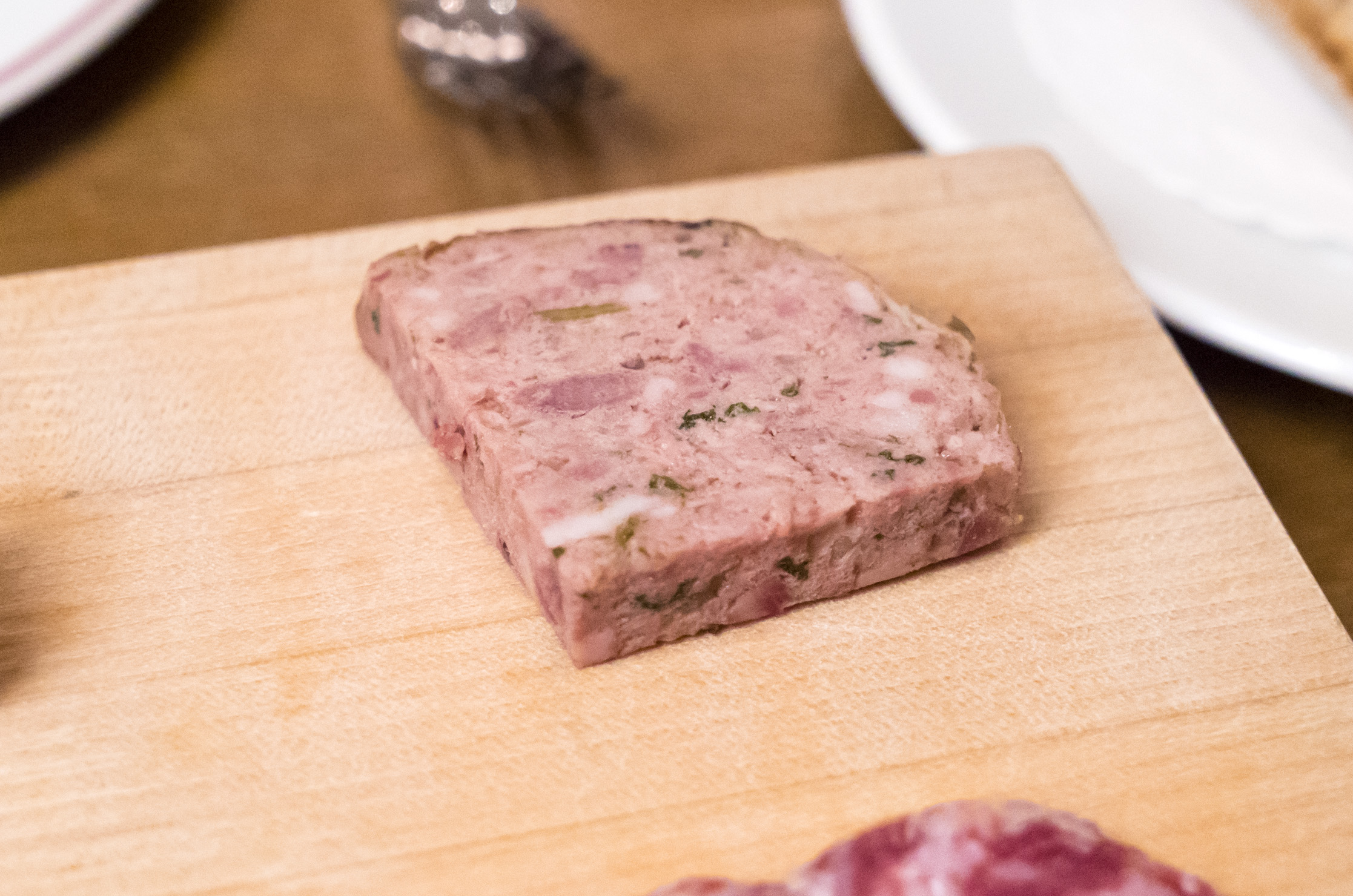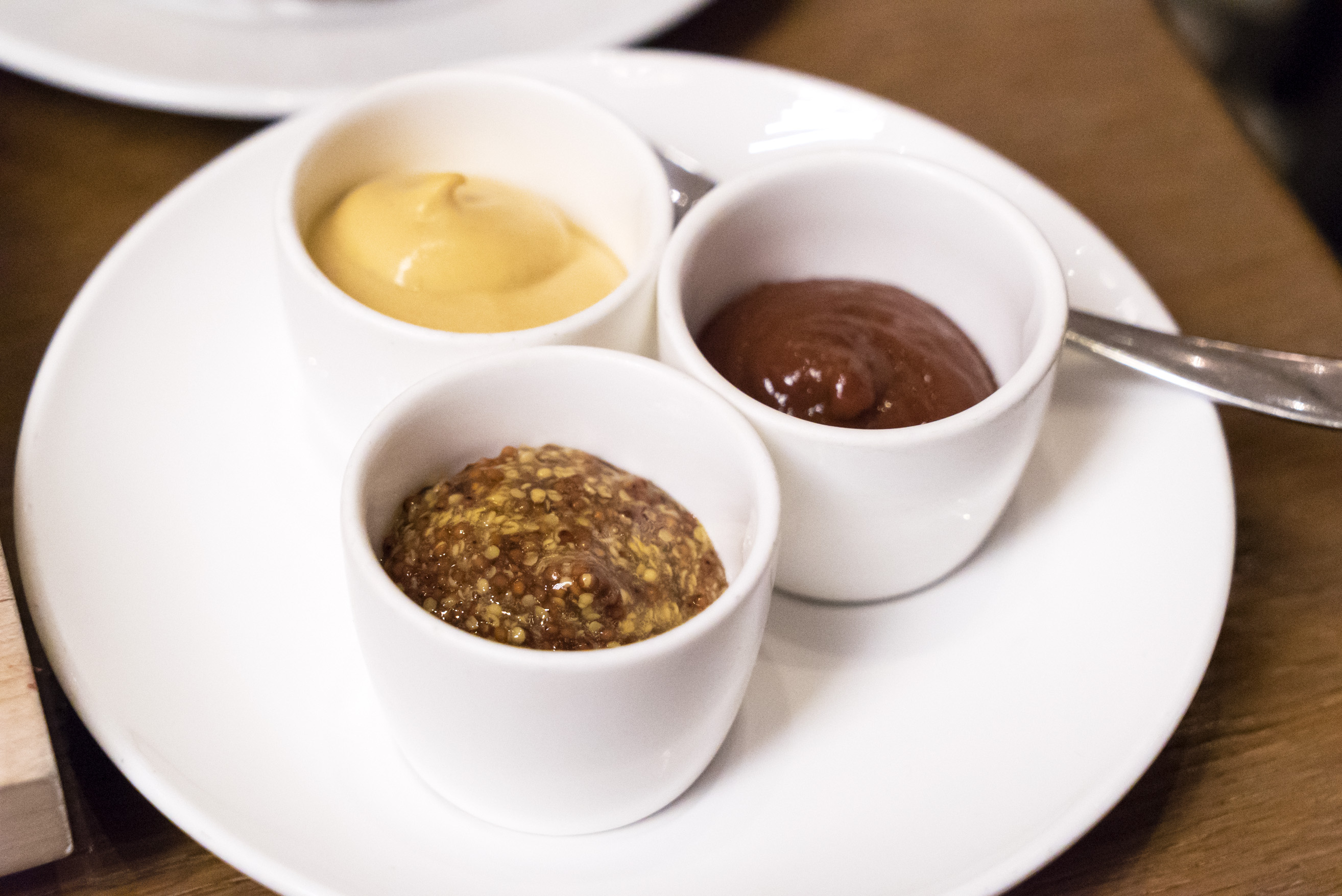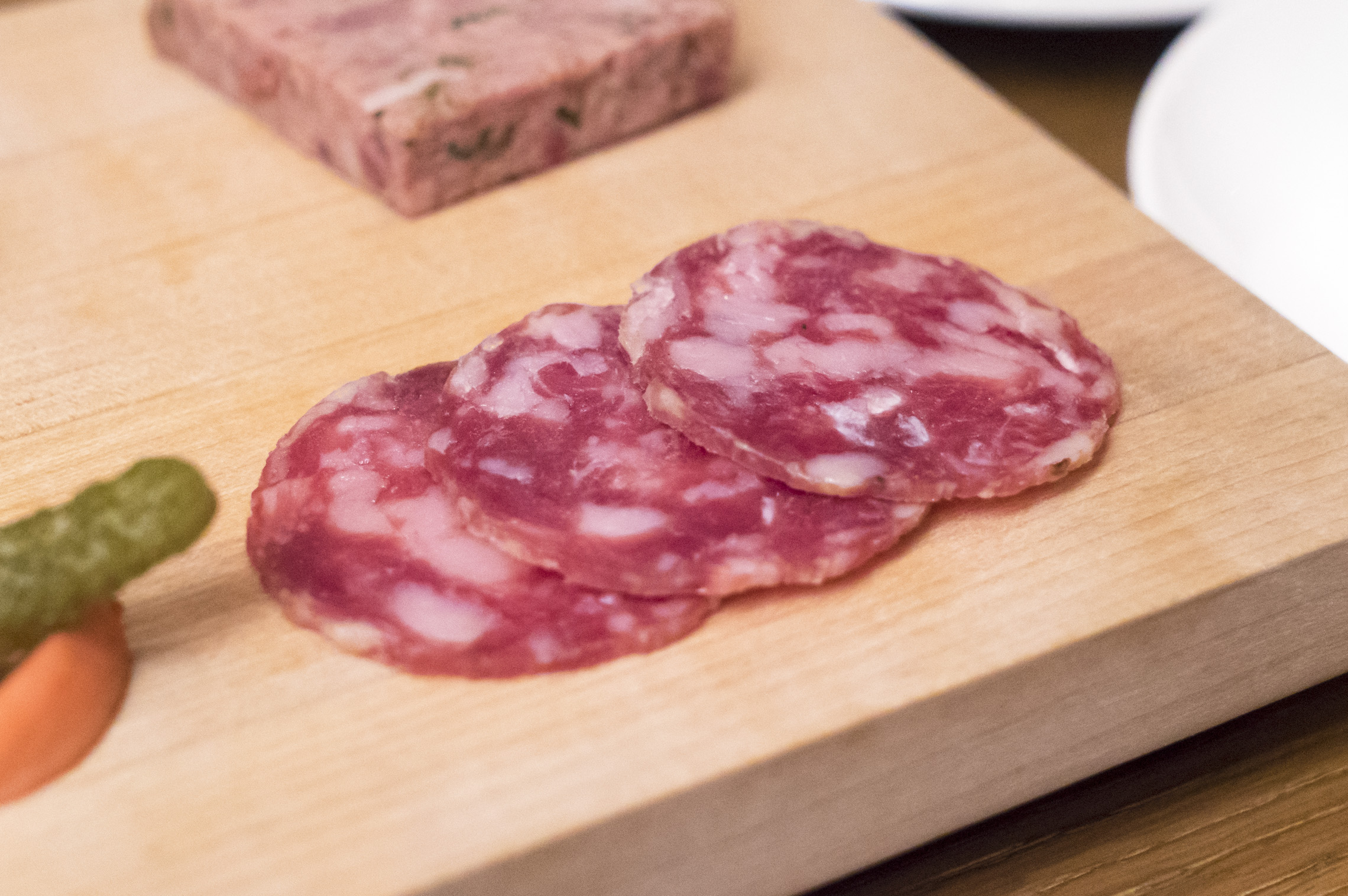 The charcuterie plate was delicious. There were four different types of meats: head cheese, pate and two sausages, served with a trio of sherry mustard, dijon mustard, and whole grain. I think my favorite meat was the pate, and my favorite mustard was the sherry.