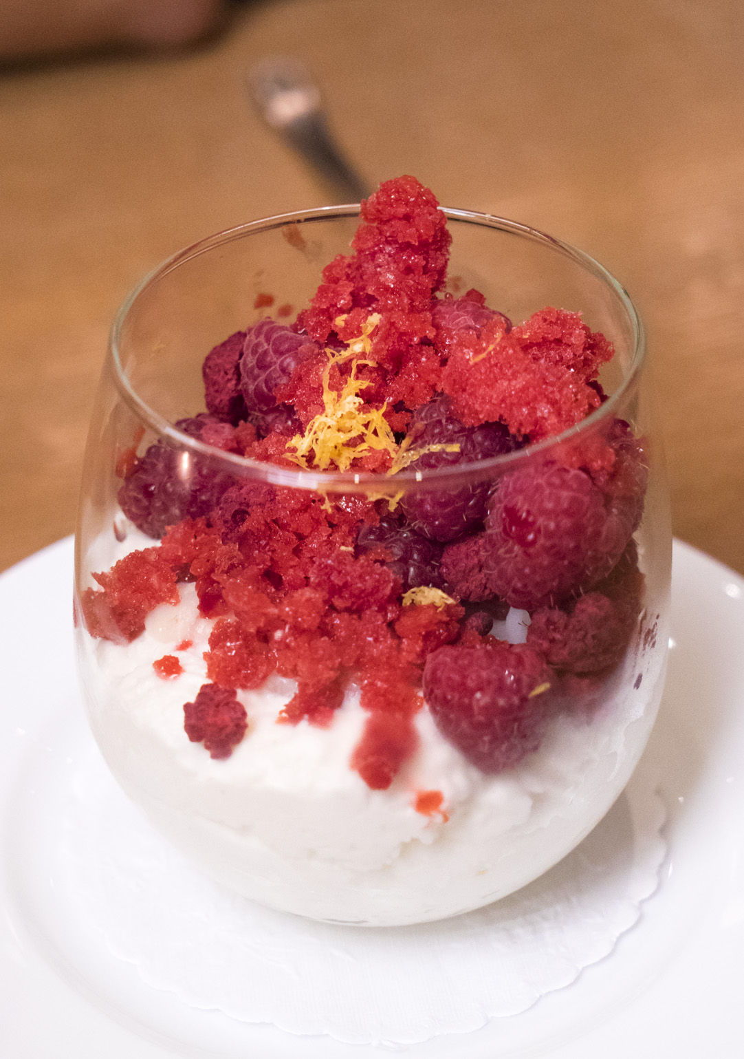 For dessert we shared this lychee mousse with raspberries. It was really light and refreshing, and little bits of soft spongecake throughout. There was also some freeze-dried berries on top too that were really tart – they added a nice pop to this item.
