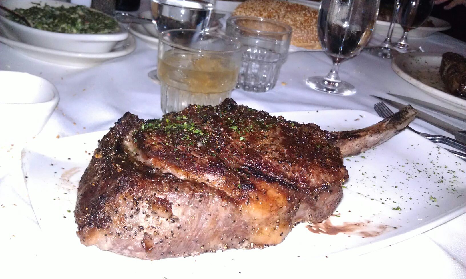 I ordered the ribeye that they had on special; a 22oz bone-in cut of heaven. It had a nice seasoned crust, the kind of marbled fat that just melts away and gets really soft, and it was perfectly cooked. It could have rested another two minutes, but that didn’t alter juice or flavor qualities. My friend ordered the filet. I had a bite of that, and it was delicious and well seasoned too. Del Frisco’s certainly lived up to the hype for me in terms of flavor. On a second trip with a couple of buddies from Junior High, High School and beyond, I ordered the house special: the double eagle bone-in strip. It, too was cooked perfectly and tasted delicious. On the third trip I had the $94 wagyu ribeye, which was easily one of the best steaks I’ve ever had in my life (if not THE best). It was 32oz of pure heaven. Delicious flavor from end to end; juicy, tender, and cooked to a perfect medium rare. See the pic below: