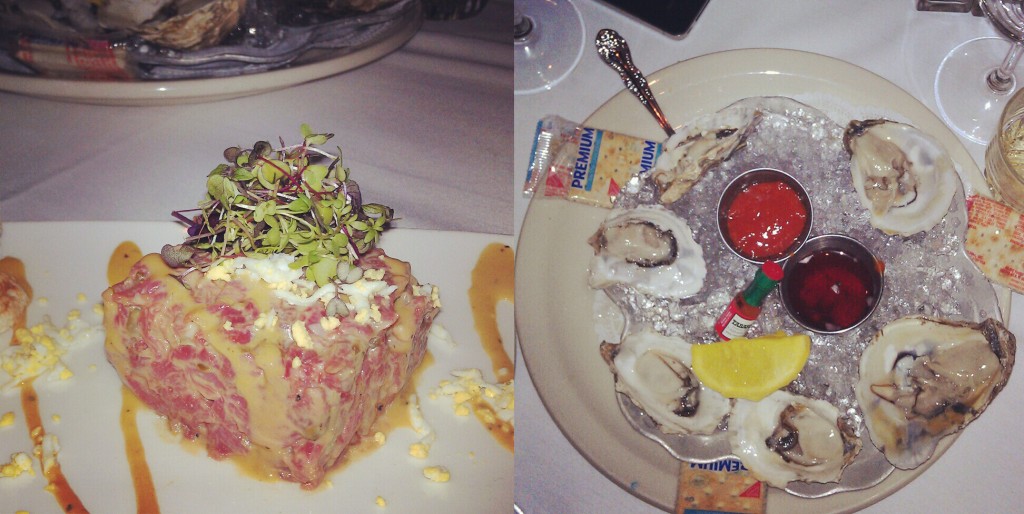 I had been told – no ORDERED – by a friend to get the crab cake, so I did. It was a succulent 4oz ball with mostly lump crab meat and a bit of breadcrumb for texture. It sat upon a nice spicy lobster-based, peppery sauce. The creamed spinach, called “spinach supreme,” had bacon folded into it, perhaps cheese as well. Delicious. My friend recommended the skillet potato dish as well – which was like fresh homemade potato chips topped with sauteed caramelized onions; not too greasy, not too salty. Really tasty. For dessert, we ordered a massive slice of lemon cake that was not on the menu (a secret item they don’t generally offer – you have to know about it). To quote one friend, it was WAY more moist than Starbucks’ lemon loaf, that is for damned sure. I’m generally not a cake person but it was yummy, even if rumors say it is made from four boxes of Duncan Hines cake mix. On a second trip, we had a dozen oysters, lobster mac & cheese, steak tartare, and the obligatory crab cakes and creamed spinach. I must say, the lobster mac & cheese was freaking delicious. It was nice and creamy, it had great crunch for texture, and the lobster bits were pretty good too. The oysters were perfect, but the steak tartare was one of the best and largest orders I’ve ever had. It had to be a solid 2-3 inches high, and 3-4 inches on each side. A nice brick of raw meat. What better way to prime the gullet before a nice steak dinner?