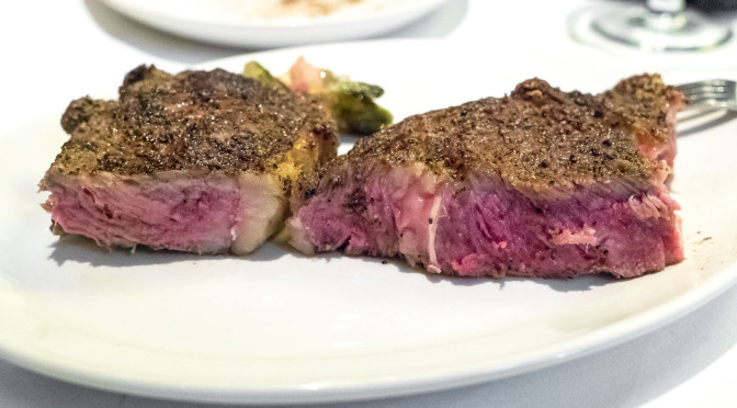 The filet comes in two flavors: vaginal (8oz) and quasi-manly (12oz). They also have 16oz strips and ribeyes (boneless) – a bit on the small side but not horrific. They also offer a signature bone-in “double eagle” strip at 26oz, as well as a 24oz porterhouse, and a special bone-in filet at 16oz. The relatively smaller sizes make it easy for the eye to wander to the 38oz “wagyu” ribeye at 2x the price, or the specials at 1.5x the price. Well worth the up-charge, in my opinion. The plating is super-basic. But for real men with balls swinging between their legs, plating isn’t really something you go yammering to your friends about anyway.