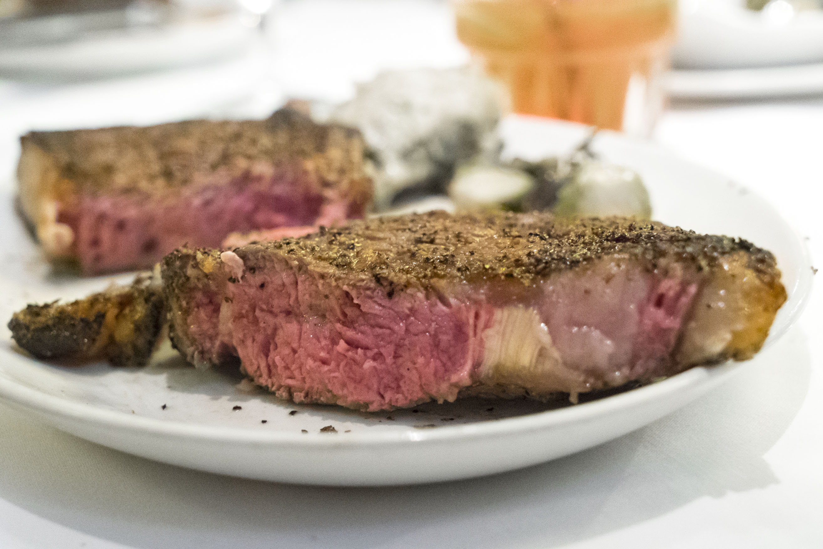 Aside from the “wagyu” ribeye, the other carcasses were on the order of lamb chops, veal porterhouse, pork porterhouse and roasted chicken. That covers the whole basic range. Those are all standard menu items, so it is a good selection for people who don’t feel like being a man. On special there was the 22oz bone-in ribeye, which I had ($65). There was also the conundrum 16oz bone-in filet ($68) and trio of filets (also somewhere in the low to mid $60s range). They also had some seasonal shellfish special appetizers too.