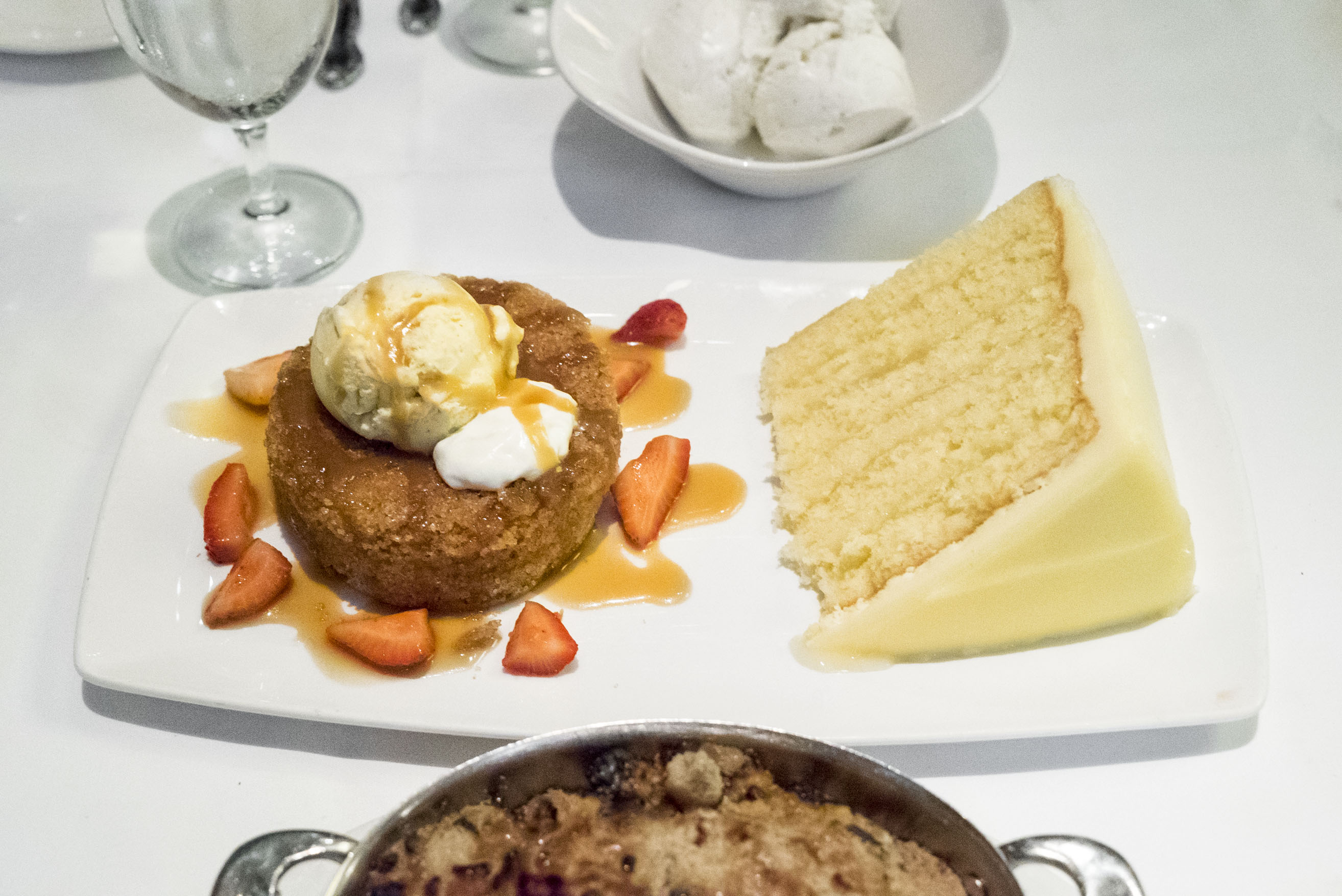 For dessert, we tried the lemon cake, as it is a crowd favorite and secret menu gem, as well as the sweet potato casserole (with ice cream on top). I have to say that the version at Ruth’s Chris is better. That lemon cake, though, is wonderful. The cake is moist without being too heavy or dense. And while there is a LOT of frosting on this baby, it is really tasty and I didn’t think it was overly sweet.