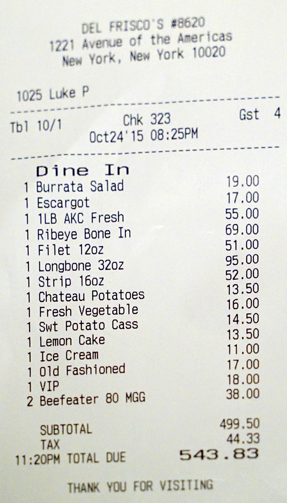 I HAD to include the bill from the third visit, simply because it oozed manliness (with the exception of the trio of filets that was ordered… and the patron cafe’s were also mocked as well):