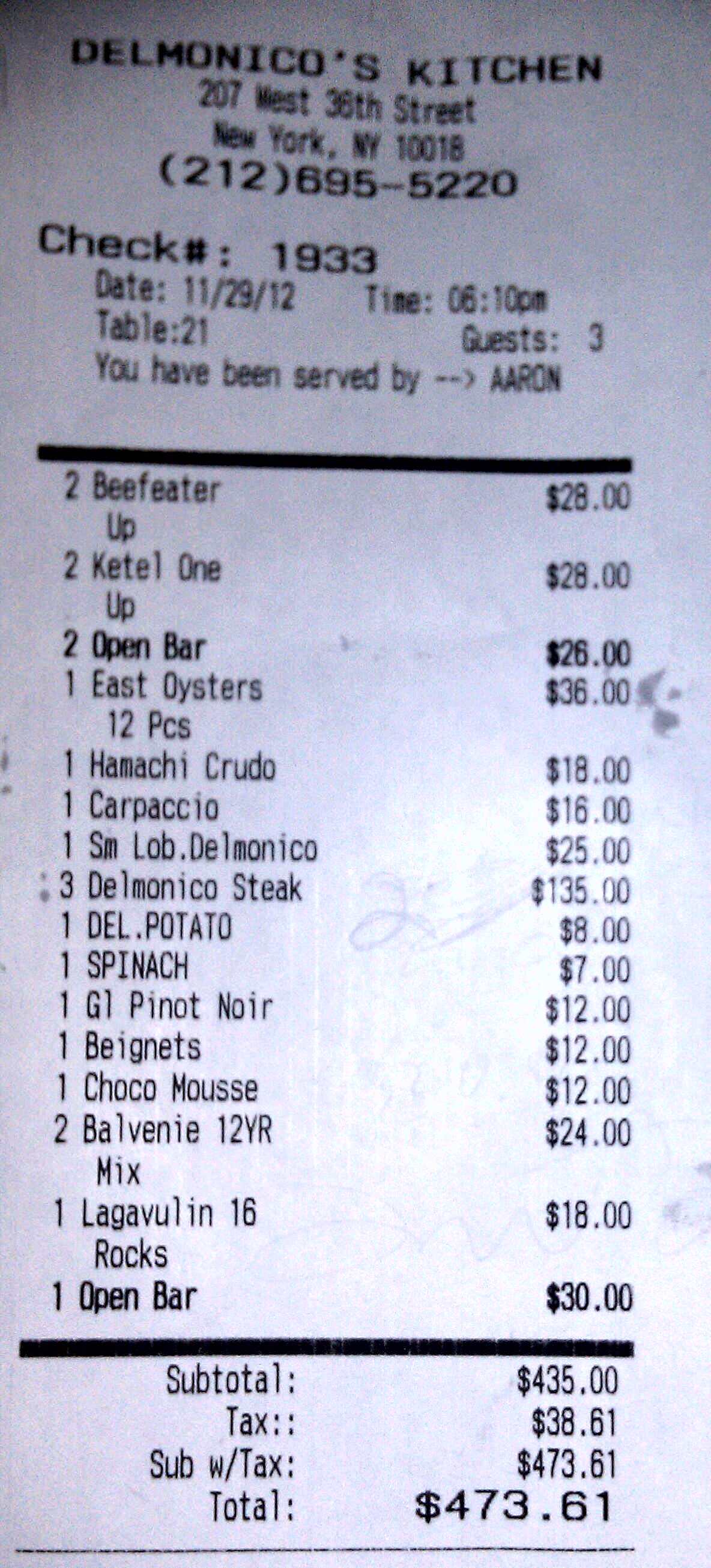 As to be expected at a Delmonico’s establishment, the service here is impeccable. Our server, Aaron, was fabulous, and the manager Dennis came over to the table and hung out with us for a bit and told us all about the new establishment and how things were happening with hurricane Sandy and their grand opening. Great guys, the both of them. The table breads were warm and varied from raisin bread, to “everything bagel” flavor logs, to olive bread. And the butter is whipped, smooth, creamy, soft, and sprinkled with a natural salt. Really nice way to start the meal. Only bad thing was that when I placed the reservation online, I said we were celebrating a friends birthday. No one wished him a happy birthday. My experience with online reservations has always been that places make an effort to do a little something when you put notes into the form. On the second trip, Aaron waited on me again, and not only did he remember me, but he also remembered my drink. Now THAT is service…