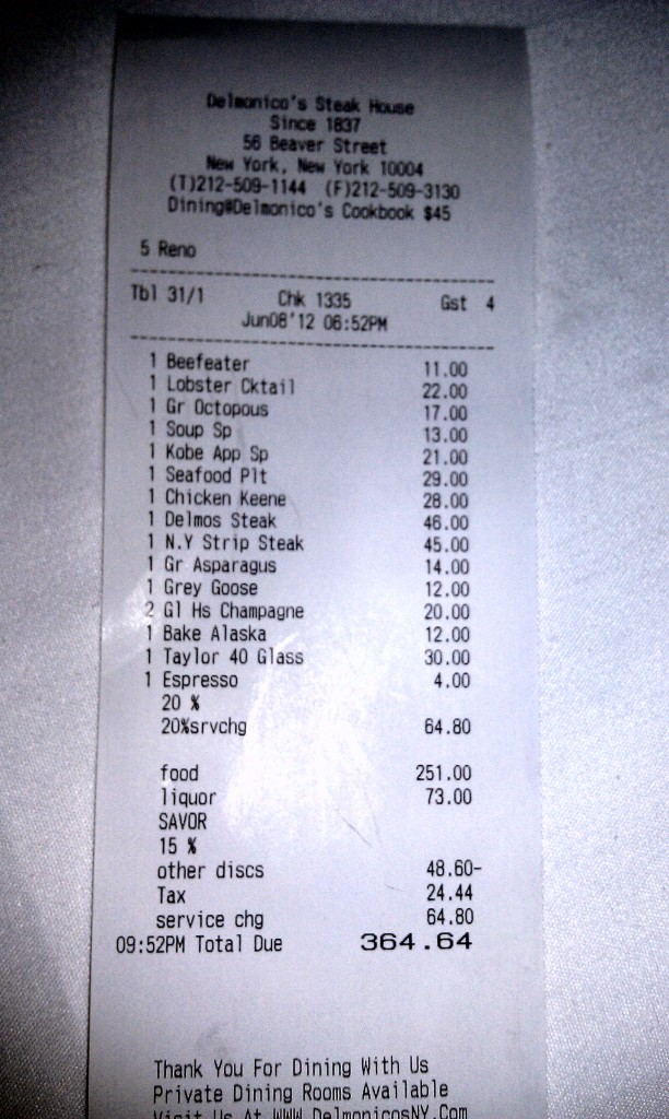 The prices are average to slightly high, but given the exceptional flavor of the steak, it is totally worth it. I thought the foie gras was overpriced and small ($21 on first visit, $24 on fourth visit), but hey – it IS goose liver. We were nice and full, but not uncomfortable, like lions after devouring a wildebeest. That said, I got 30% off through Village Vines, which was a bonus. They also offer the same deal for (aged.) by the way. The total spent for four martinis ($13 and $14 each), foie gras, special oysters, creamed spinach and two steaks came to around $190, tax and tip included. We skipped dessert. On our third visit, we had a party of four and the bill felt like it was less than I expected; probably due to having a 15% discount ala Savored. As a result, I upped the points here a little, since it seems Delmonico’s is generous in terms of offering and participating in price specials and online deals. A fourth trip proved yet again to involve a great deal through the web: Groupon had a four-course meal for two at $50/pp (I think we only ended up paying $92 for the deal too, since there was a coupon code for the coupon – then our bill was only $62 at the end for drinks, tax and tip – incredible deal). Amazing, since there were very little restrictions on what you could order. In fact they even let us grab both the fois gras AND the king crab mac & cheese, both of which are over-and-above items that usually cost more than the other apps.
