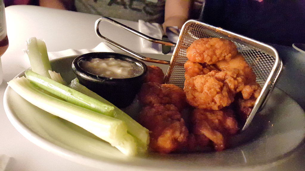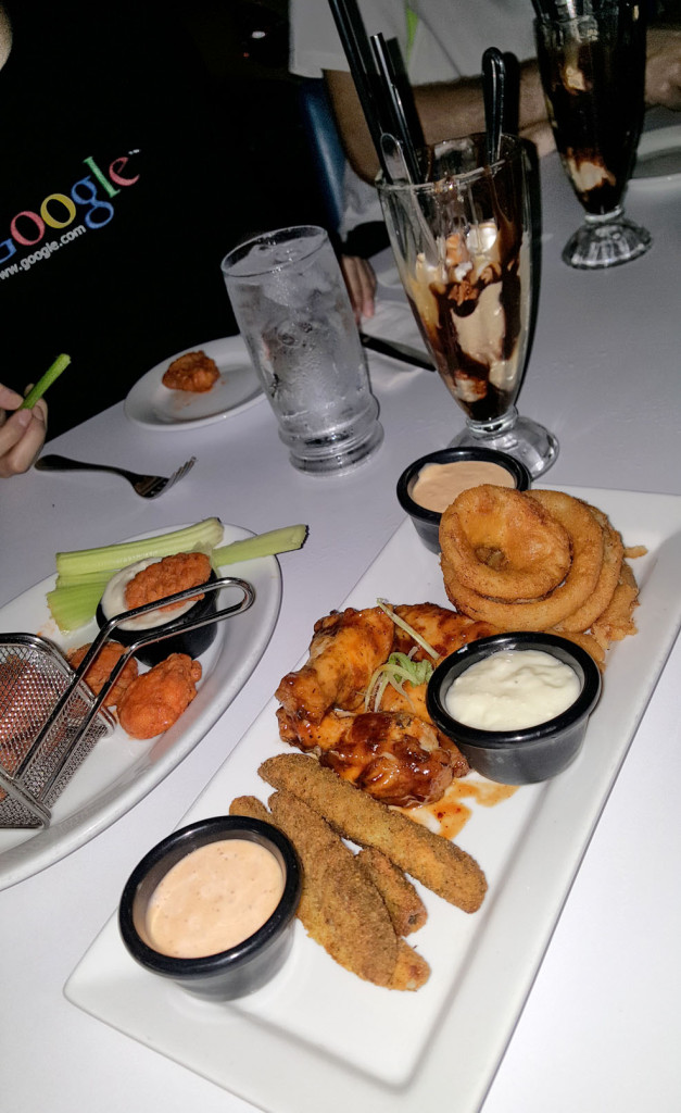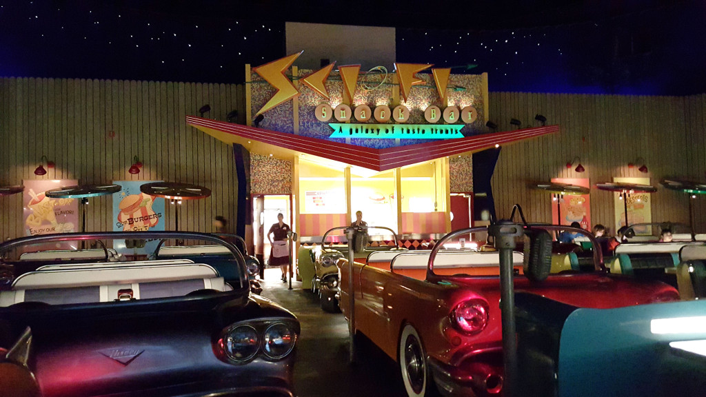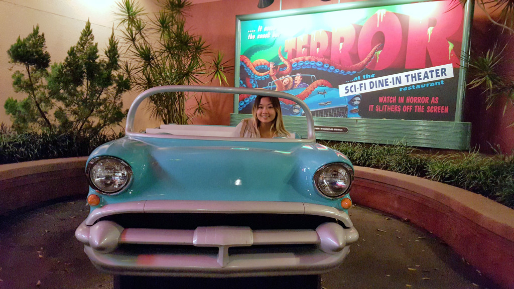 So we ended up having a snack before our main late afternoon meal at the 50’s Prime Time Cafe theme restaurant. They have turkey legs all over the place, and tons of snack and candy joints lining the roads. I didn’t eat much of that junk. The mediocre bites we had along the way were an appetizer sampler and buffalo chicken bites at the Sci Fi Snack Bar, a place that’s set up like an old 1950’s drive-in movie theater. You sit in cars and face a movie screen that plays old B- and C- quality sci-fi movies. Fun!