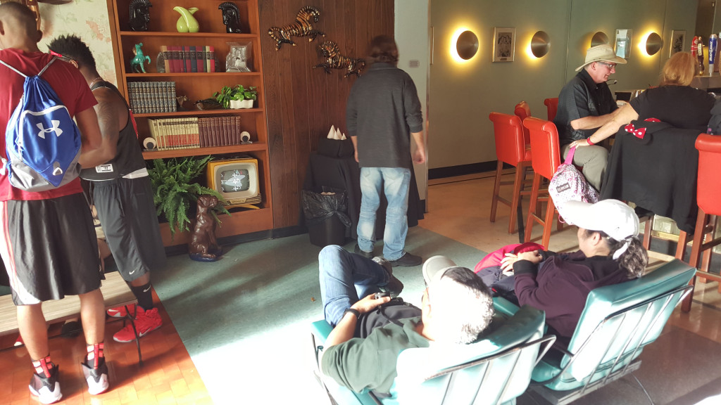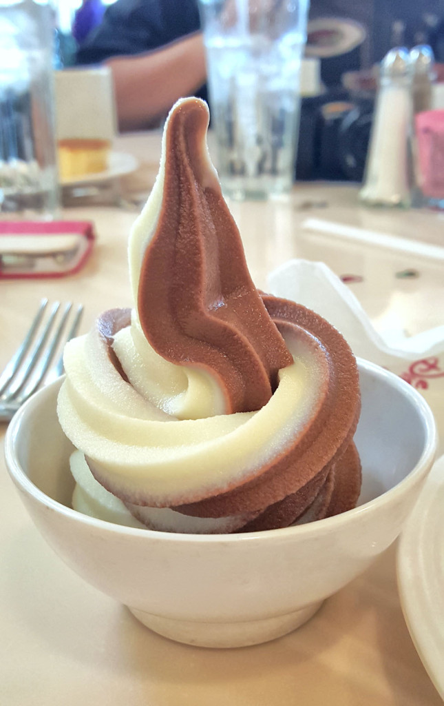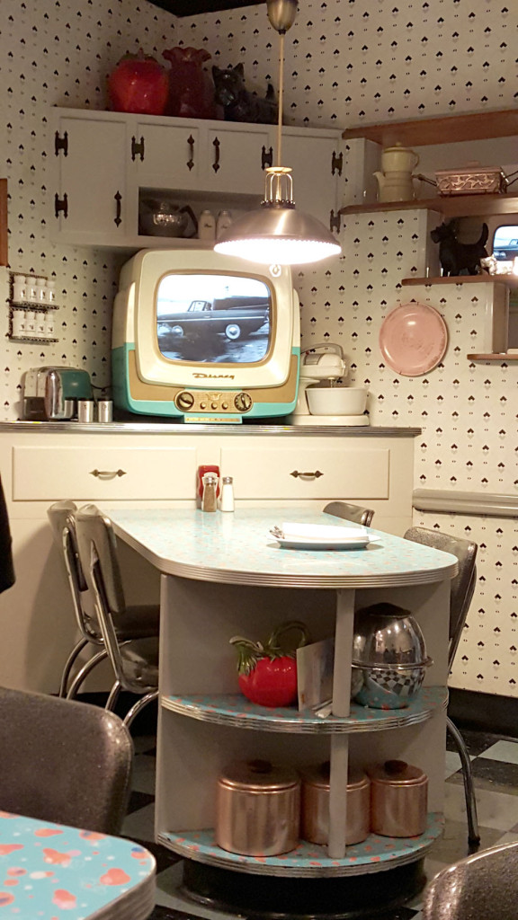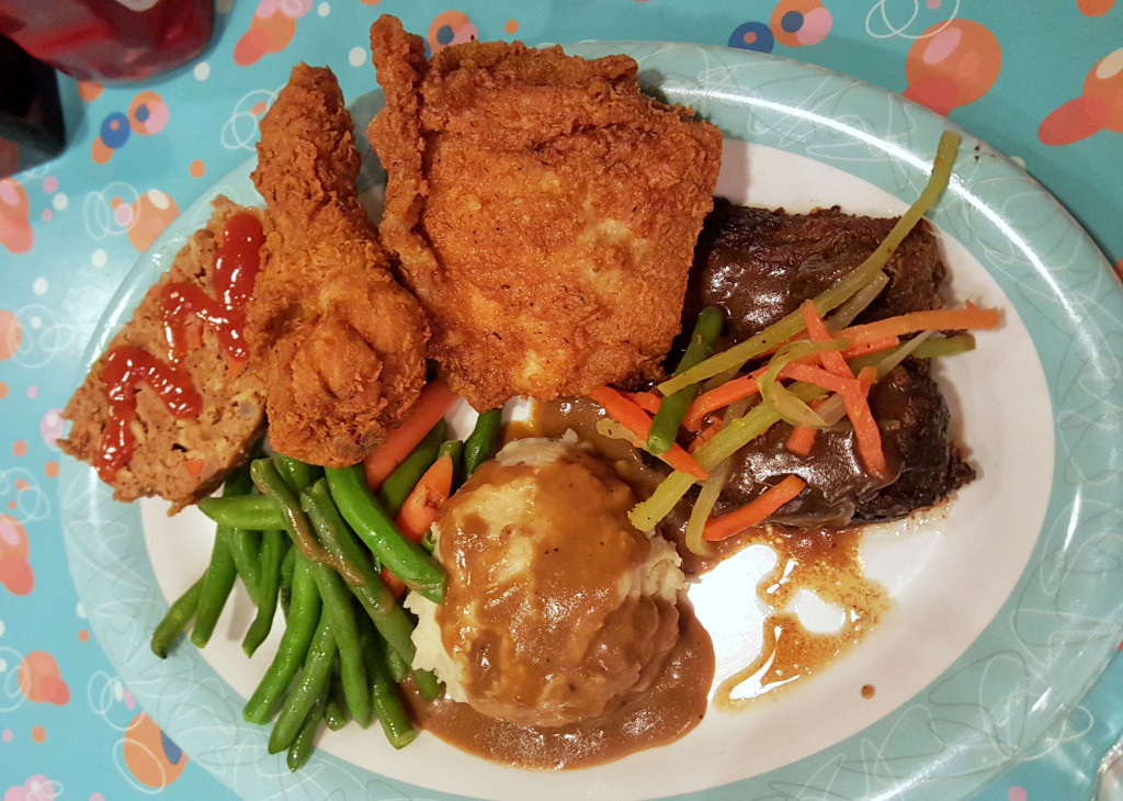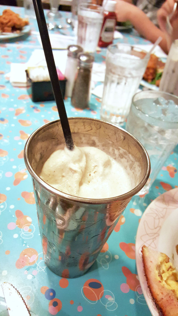 Our main meal was at 50’s Prime Time Cafe. This place is set up like the inside of a mid-century modern 1950’s or early 60’s home. Lots of round-screen tube television cabinets are playing clips of old shows from the era, and there are sea-foam green appliances and furniture, wood paneling, checkerboard floors, etc. I loved it.