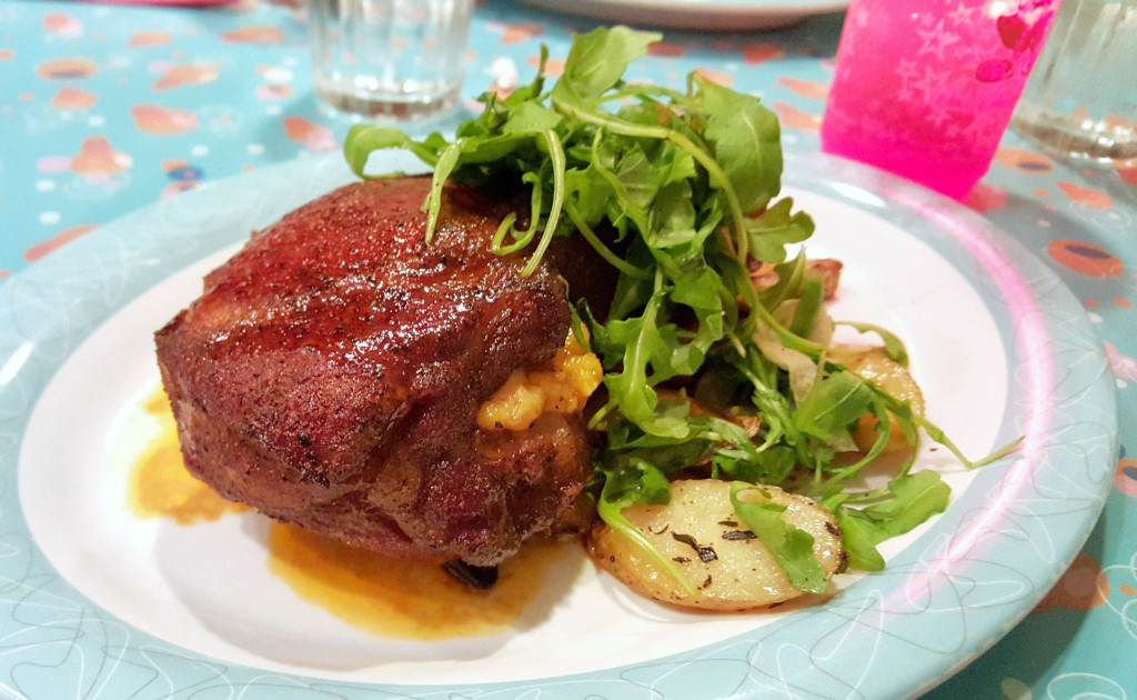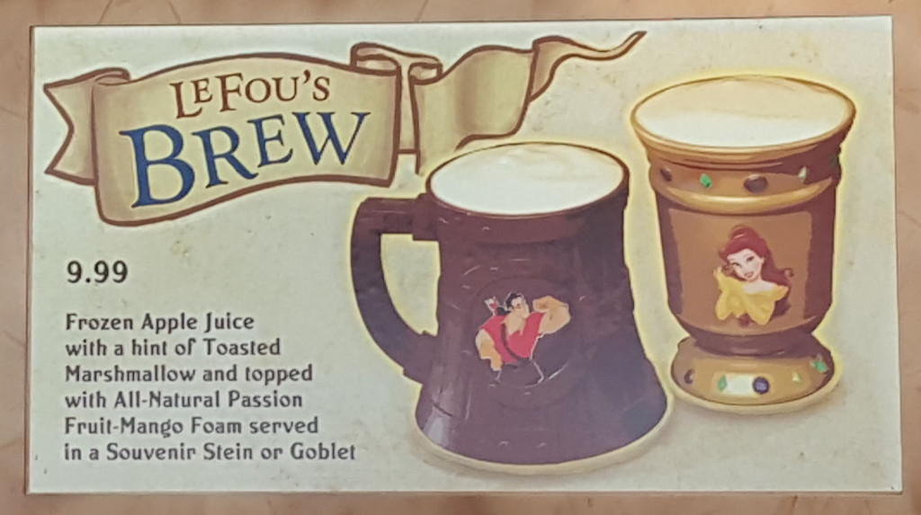 Nearby at Gaston’s, they used to sling a pork shank! I wanted so badly to walk around the park with a pig leg in my hand, but they no longer sell them. Instead we tried this slushy that was apple and cinnamon flavored, called LeFou’s Brew. Really delicious: