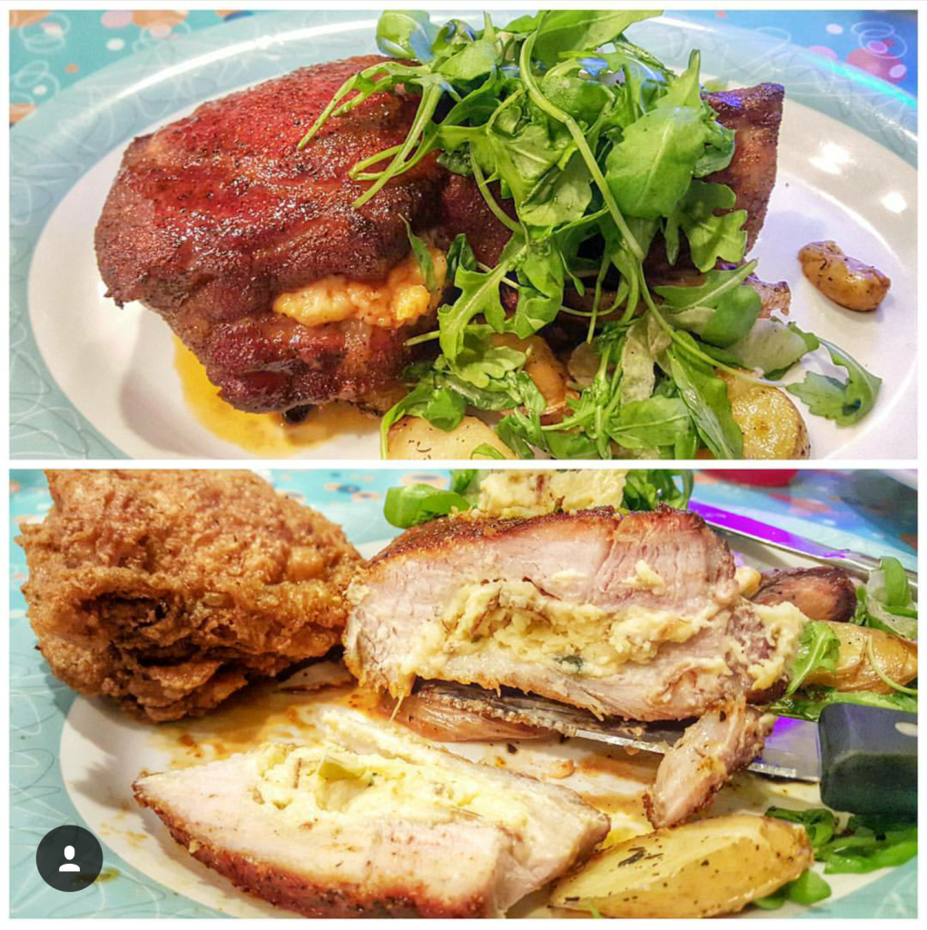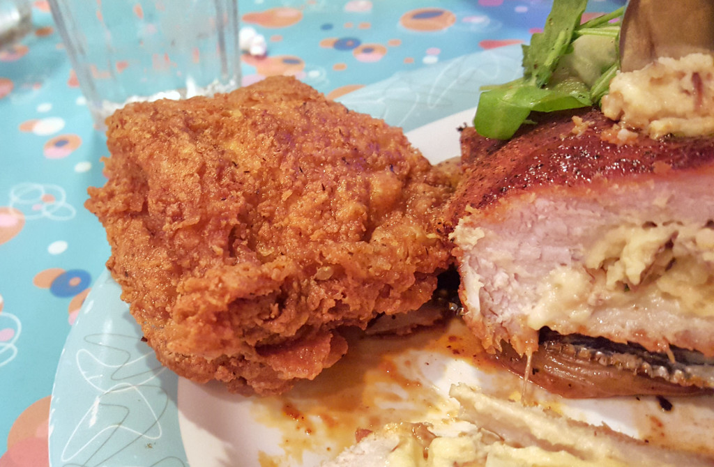 Plus the food was pretty fucking great too. Everything is home-style cooking, like stuff that your grandma would cook for you. I ordered a smoked gouda stuffed pork chop. It was absolutely awesome. Juicy inside, crispy outside, good stuffing. I demolished it.